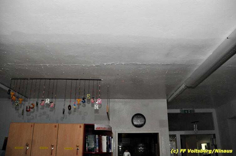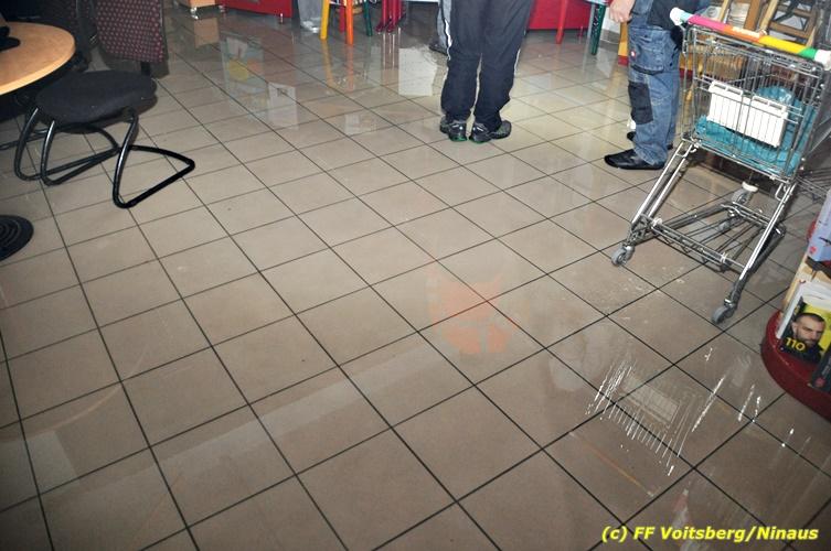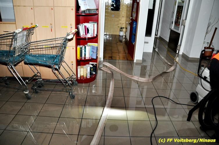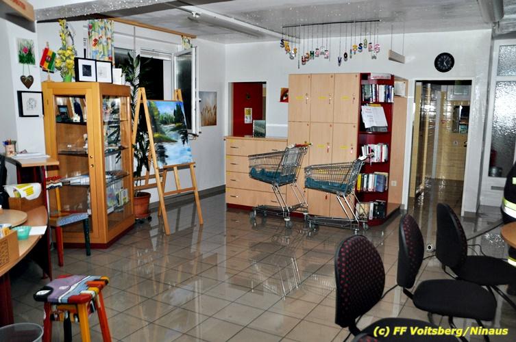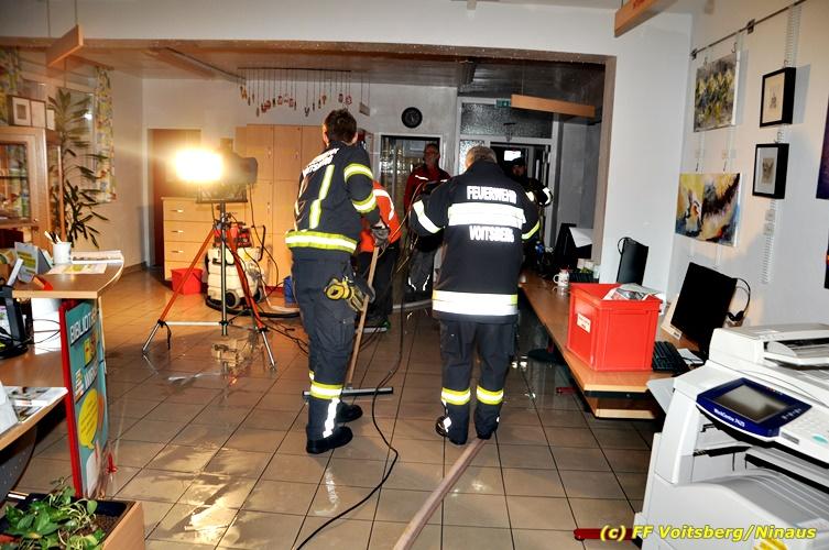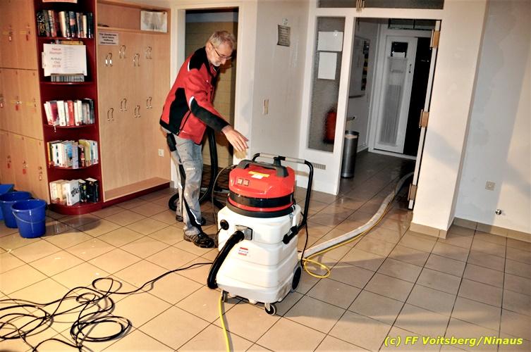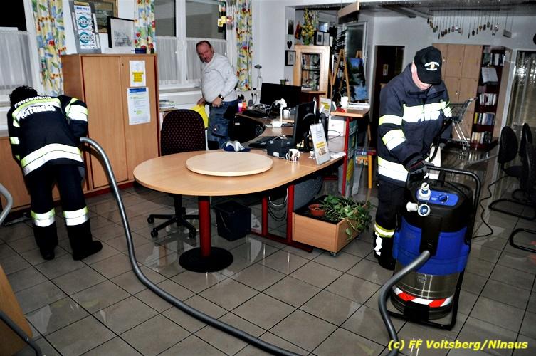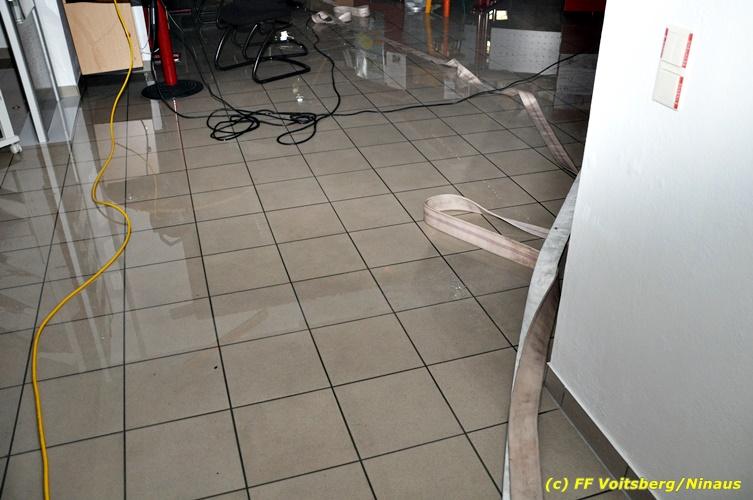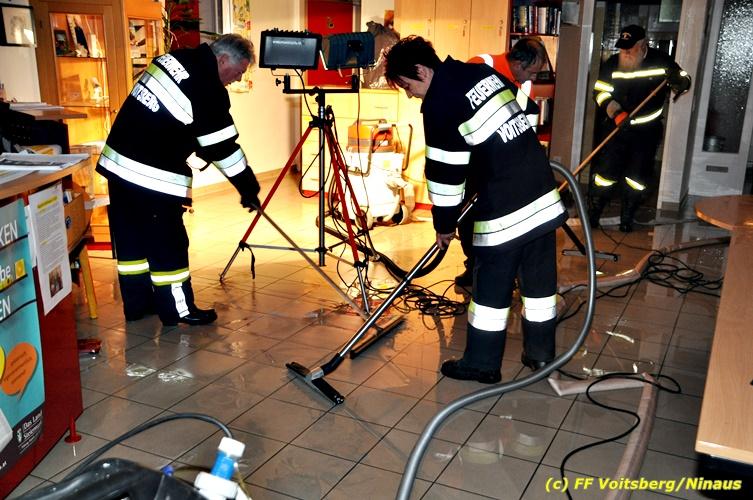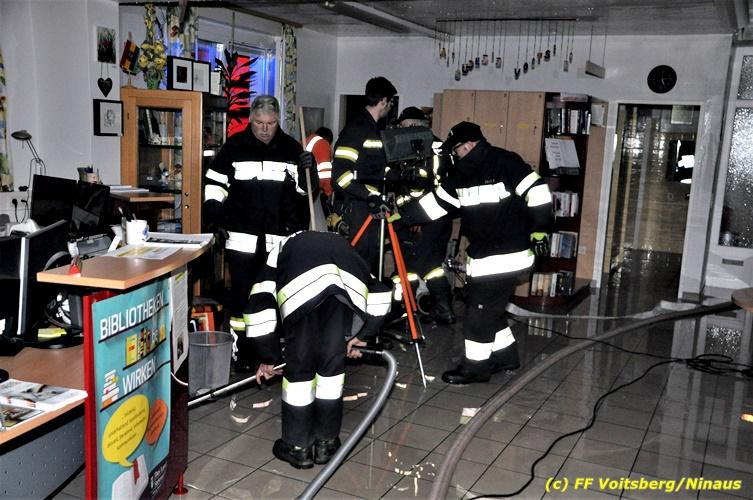 VOITSBERG, am 18.11.2018 Am Sonntag, 18. November 2018 in den Nachmittagsstunden bemerkte ein aufmerksamer Passant, dass beim Gebäude der Musikschule in Voitsberg an der Außenwand Wasser nach unten rinnt und verständigte unverzüglich die Polizei Voitsberg. Nach deren Erkundung wurde der Bereitschaftsdienst des Bauhofes Voitsberg verständigt. Nach der Feststellung der Ursache, eines geplatzten Wasserschlauches im ersten Obergeschoß, wurde der Hauptwasserhahn abgedreht und die FF Voitsberg zur Unterstützung der Abpumparbeiten in der darunterliegenden Stadtbücherei angefordert. Mit insgesamt drei Nasssaugern der FF Voitsberg und des Bauhofes Voitsberg und eines aufgrund des Stromausfalls eingesetzten Notstromaggregates der FF Voitsberg konnte die Stadtbücherei, welche auf einer Fläche von ca. 70 m2 überflutet war, nach 1 Stunde wieder trockengelegt werden. Eingesetzt Kräfte: FF Voitsberg mit 7 Kameraden Bauhof Voitsberg mit 3 Kräften Polizei Voitsberg mit 2 Beamten Einsatzleiter: BI Karlheinz Buchegger, FF Voitsberg Text und Fotos: Walter Ninaus, FF Voitsberg