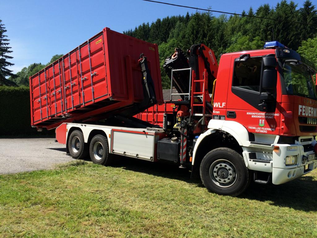 VOITSBERG, am 16.06.2014 Arbeiten nach dem Bereichsjugend-Leistungsbewerb der FF Afling. Zwei Container wurden im Auftrage der FF Afling von Afling nach Lebring mit dem WLF transportiert.