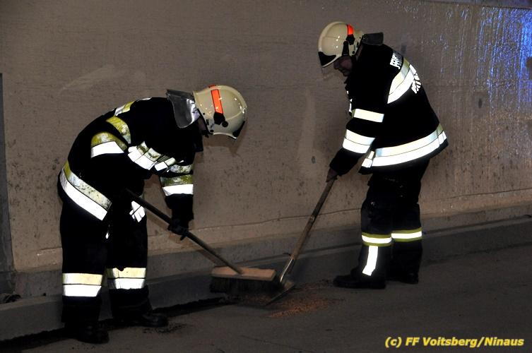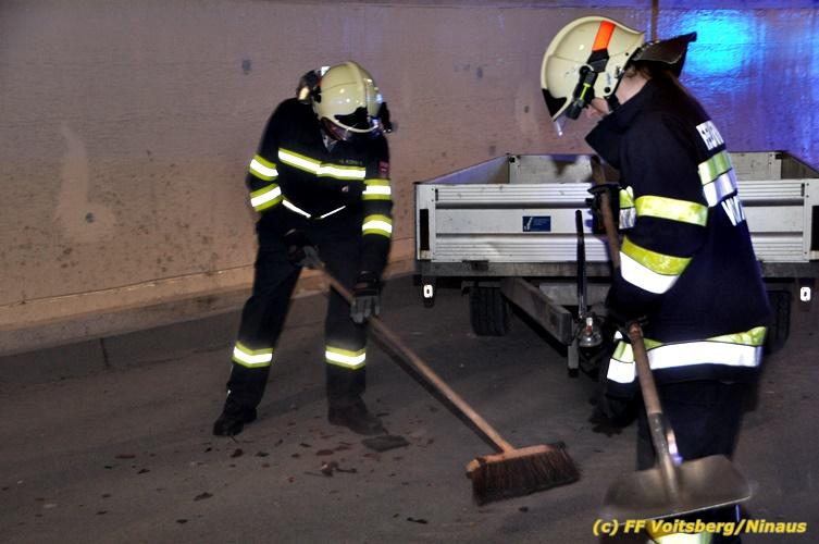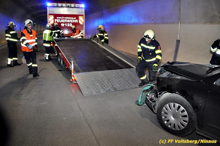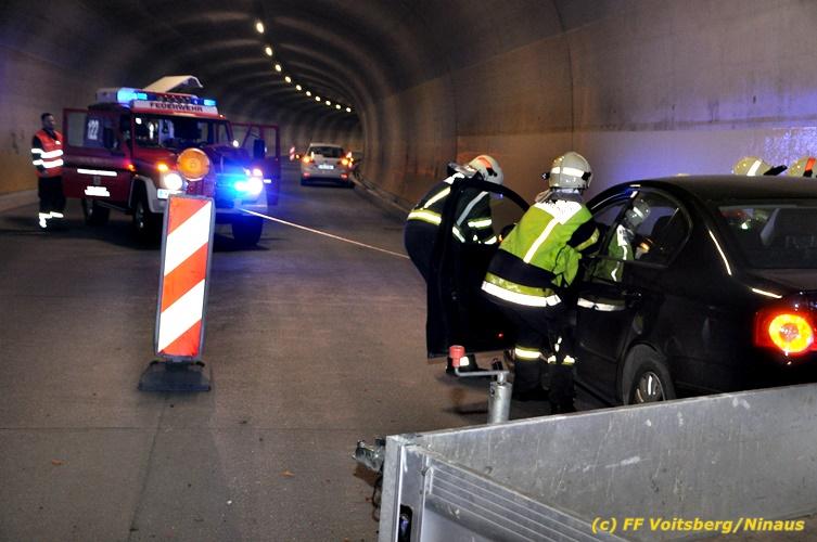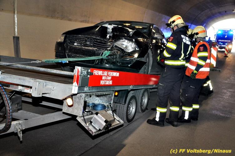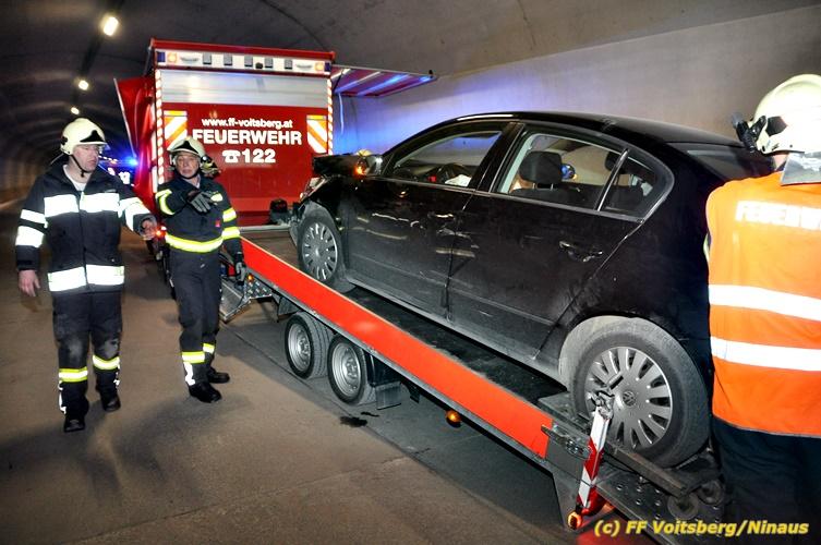 VOITSBERG, am 01.03.2019 Am Freitag, 1. März 2019 gegen 15 Uhr kam es im Voitsberger Umfahrungstunnel zu einem Verkehrsunfall. Ein PKW geriet gegen einen auf der Baustelle abgestellten Anhänger. Das Fahrzeug wurde schwer beschädigt und der Lenker konnte die Fahrt nicht mehr fortsetzen. Bei Ankunft der Einsatzkräfte konnte kein Lenker aufgefunden werden und die Ermittlungen wurden durch die Polizei Voitsberg eingeleitet. Aufgrund des Schadens kann es auch sein, dass sich im Fahrzeug zwei Personen befanden. Die alarmierte FF Voitsberg barg den PKW mittels Mehrzweckanhängers und den leicht beschädigten Anhänger mit einem Zugfahrzeug. Ausgeflossene Betriebsmittel wurden gebunden und entsorgt sowie herumliegende Wrackteile von der Fahrbahn entfernt. Während der Aufräumungs- und Bergungsarbeiten war der Umfahrungstunnel auch Richtung Köflach für ca. 30 Minuten gesperrt, wobei es im Stadtgebiet Voitsberg zu erheblichen Staus kam. Eingesetzte Kräfte: FF Voitsberg unter Einsatzleiter OBI Bernd Unger mit 12 Kräften Polizei Voitsberg mit 2 Beamten Text und Fotos: Walter Ninaus, FF Voitsberg