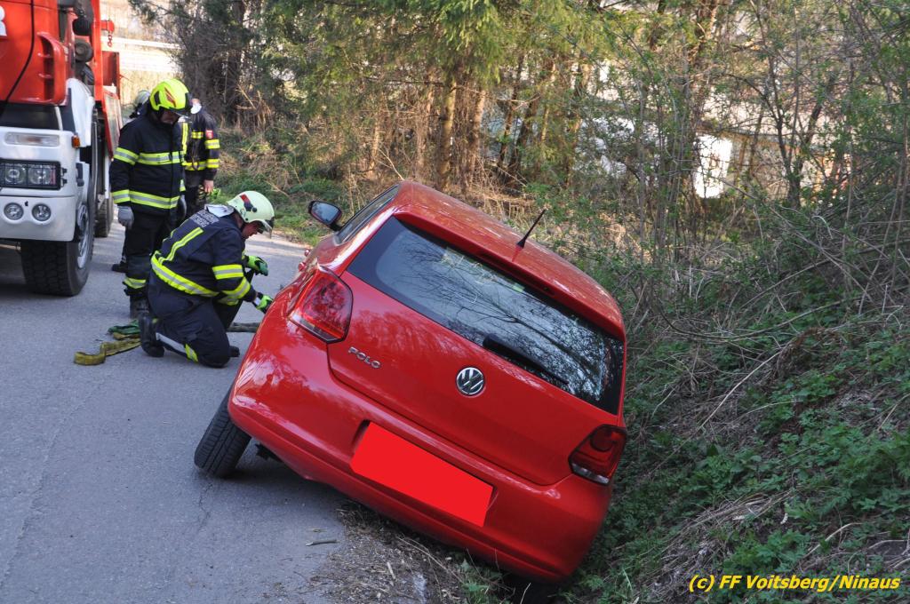 VOITSBERG, am 31.03.2019 Am Sonntag, 31. März 2019 geriet in den Nachmittagsstunden ein PKW auf einer Gemeindestrasse in Bärnbach von der Straße ab und kam in einer Regenrinne zu stehen, wobei das Fahrzeug mit der Bodenplatte aufsaß. Die alarmierte FF Bärnbach sicherte die Unfallstelle ab und forderte zur Bergung das WLF-Kran der FF Voitsberg an. Das Fahrzeug wurde unbeschädigt geborgen und konnte die Fahrt auf eigener Achse fortsetzen. Verletzt wurde niemand. Eingesetzte Kräfte unter Einsatzleiter OBI Michael Witreich FF Bärnbach mit 15 Kräften FF Voitsberg mit 8 Kräften Text und Fotos: Walter Ninaus, FF Voitsberg