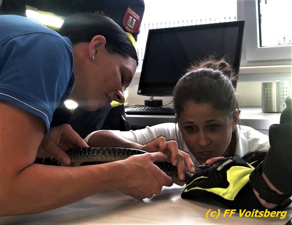 VOITSBERG, am 27.05.2019 Ein aufmerksamer Hausbesitzer am Voitsberger Schlossberg entdeckte am Montag, 27. Mai 2019 in den Vormittagsstunden eine Schlange an einem Zaun unter einem Gebüsch, die sich in einem Drahtgeflecht verfangen hatte. Die FF Voitsberg wurde zur Tierrettung alarmiert und rückte mit 2 Mann aus. Die Schlange konnte rasch aus ihrer misslichen Lage befreit werden, das Drahtgeflecht hatte sich jedoch so um ihren Körper gewickelt, dass es mit den Werkzeugen der Feuerwehr nicht entfernt werden konnte. Das Tier wurde in die ACC Tierklinik nach Rosental gebracht, wo es einer Tierärztin gelang, das eng anliegende Drahtgeflecht vom Körper der Schlange zu entfernen, ohne diese zu verletzten. Die ungiftige Äskulapnatter wurde anschließend wieder in seinen natürlichen Lebensraum verbracht und in die Freiheit entlassen. Text und Fotos: FF Voitsberg