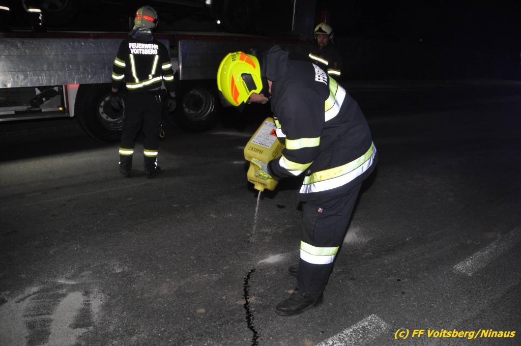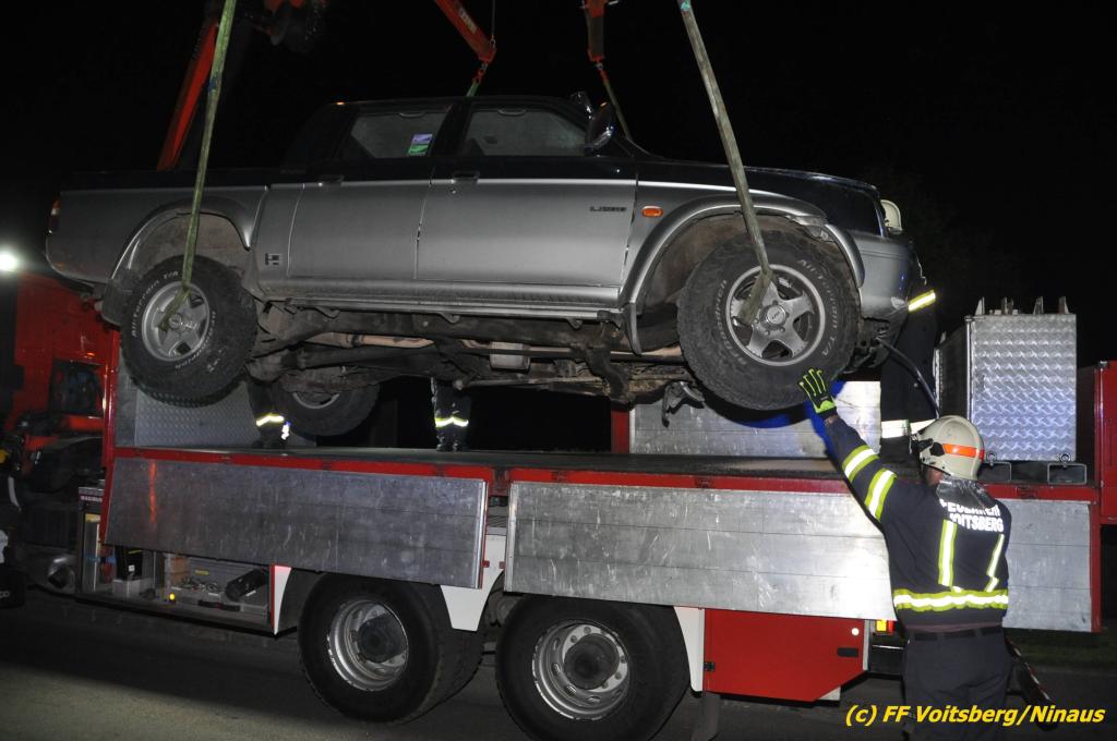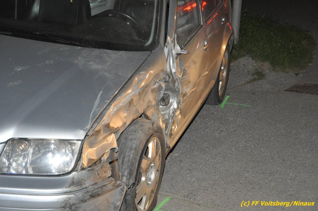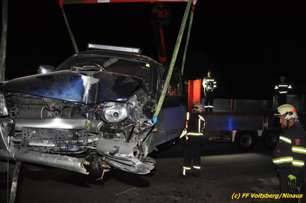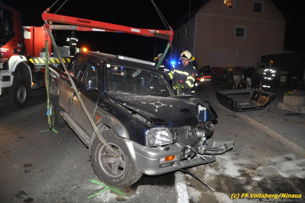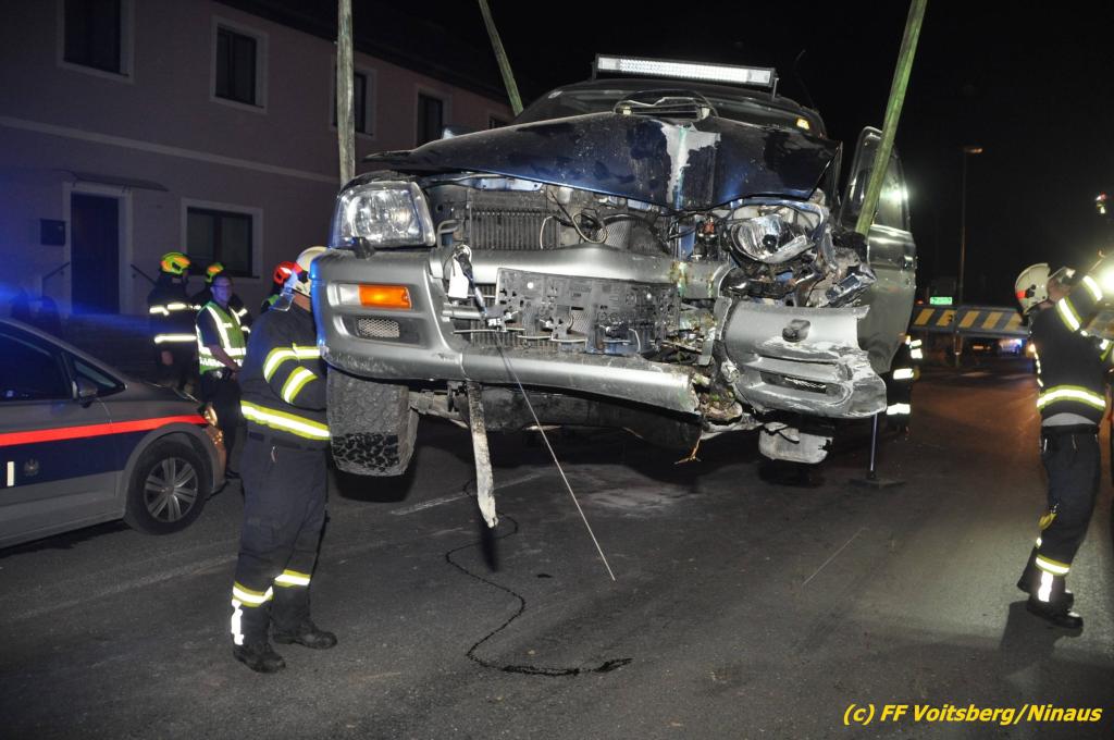 VOITSBERG, am 09.06.2019 Am Sonntag, 9. Juni 2019 kurz vor 1 Uhr früh ereignete sich auf der Kainacherstrasse in Bärnbach ein schwerer Verkehrsunfall. Ein Lenker eines geländegängigen Fahrzeuges verlor die Herrschaft über sein Fahrzeug, kam auf die linke Straßenseite, touchierte dort einen parkenden Pkw und in weiterer Folge stieß er mit voller Wucht gegen ein Wartehaus an einer Bushaltestelle. Dabei wurden die dort aufgestellten betonierten Blumenkisterl gegen ein weiteres Auto geschleudert. Beide parkenden Pkw wurden schwer beschädigt, ebenfalls das Wartehaus. Das Unfallauto kam sodann mitten auf der Landesstrasse zu stehen. Der Lenker konnte das Fahrzeug mit Verletzungen unbestimmten Grades verlassen und wurde mit dem Roten Kreuz Voitsberg in ein Krankenhaus gebracht. Die erstalarmierten Feuerwehren Bärnbach und Afling sicherten die Unfallstelle ab und bauten einen Brandschutz auf. Gleichzeitig wurden ausgeflossene Betriebsmittel gebunden und in späterer Folge fachgerecht entsorgt. Herumliegende Wrackteile wurden eingesammelt. Zwecks Bergung des schwer beschädigten Unfallwracks wurde das WLF-Kran der FF Voitsberg angefordert. Da weiterhin Betriebsmittel austraten, wurde das Fahrzeug auf einem gesicherten Stellplatz abgestellt. Die polizeilichen Erhebungen wurden von der Polizei Voitsberg durchgeführt. Eingesetzt unter Einsatzleiter Michael Kleindienst (FF Bärnbach) waren insgesamt 25 Einsatzkräfte der Feuerwehren Bärnbach, Afling und Voitsberg. Text und Fotos: Walter Ninaus, FF Voitsberg