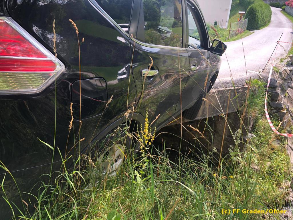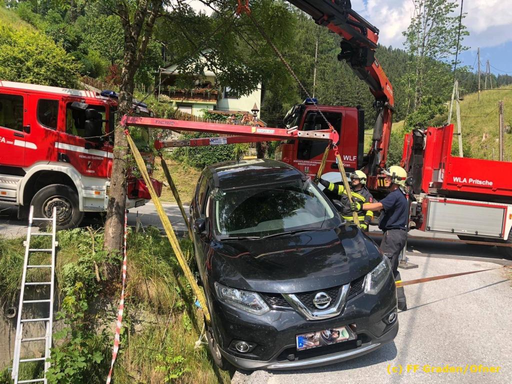 VOITSBERG, am 06.07.2019 Am Samstag, 6. Juli 2019 kurz nach Mittag kam ein Pkw von der Strasse ab und drohte abzustürzen. Er steckte mit der Bodenplatte an einer Brücke und die rechten Räder waren in der Luft. Zwecks Bergung wurde das WLF-Kran der FF Voitsberg über die LLZ Steiermark von der einsatzleitenden Feuerwehr Graden angefordert. Die Bergung verlief reibungslos, sodass der Lenker die Fahrt ohne Schaden fortsetzen konnte. Eingesetzt waren insgesamt 9 Kameraden der Feuerwehren Graden und Voitsberg. Fotos: David Ofner/FF Graden Text: Walter Ninaus/FF Voitsberg