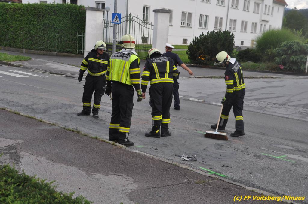 VOITSBERG, am 02.08.2019 Am Freitag, 2. August 2019 um 18:09 Uhr wurde die FF Voitsberg in die C.v.Hötzendorfstrasse zu einem Verkehrsunfall alarmiert. Bei einem Auffahrunfall waren drei Fahrzeuge beteiligt. Die Fahrzeuge wurden nach den Erhebungen der Polizei von der Straße gebracht. Herumliegende Wrackteile wurden eingesammelt und ausgelaufene Betriebsmittel gebunden und fachgerecht entsorgt. Verletzt wurde niemand. Durch die Bergungs- und Vermessungsarbeiten kam es im gesamten Stadtgebiet Voitsberg zu einem ausgedehnten Stau. Eingesetzt unter der Einsatzleitung von Harald Kremaucz waren 8 Kameraden der FF Voitsberg sowie zwei Streifen der Polizei.