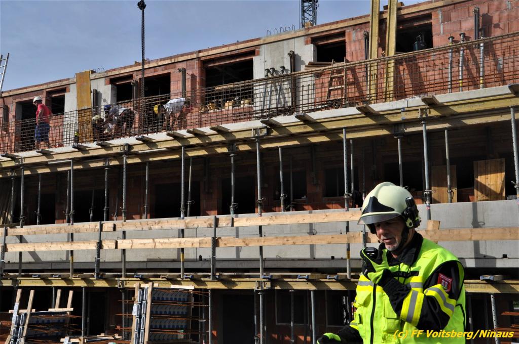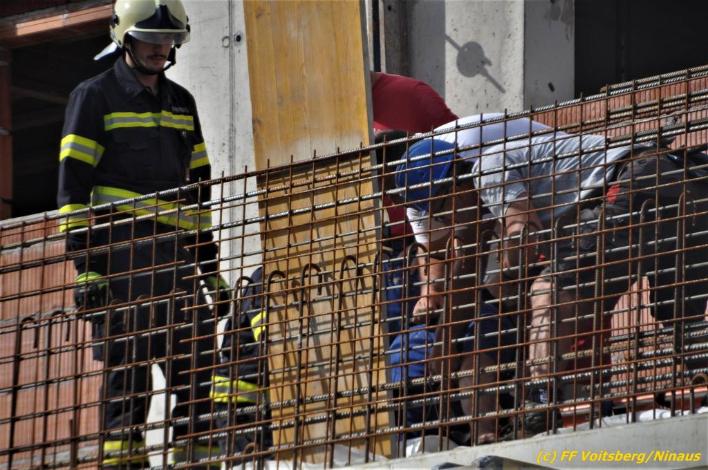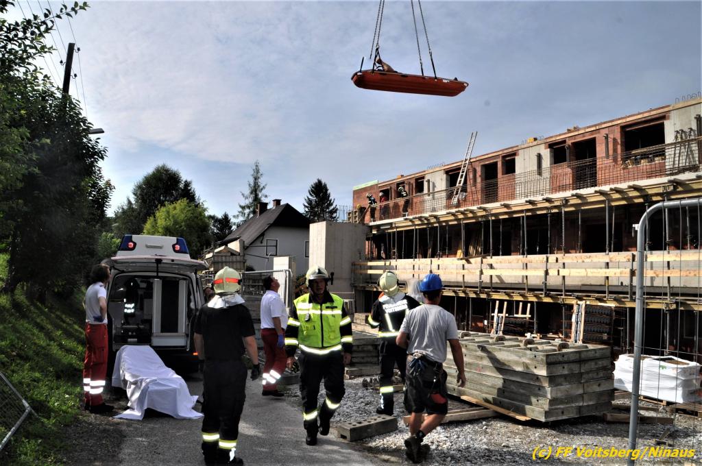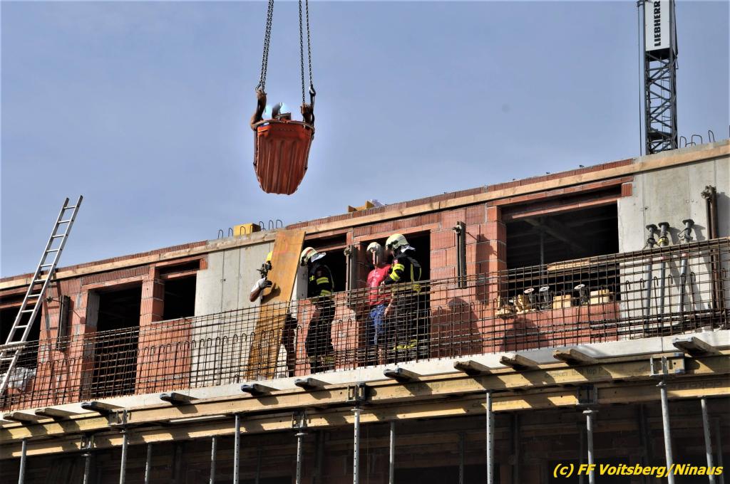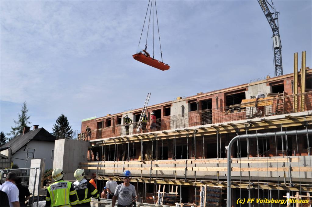 VOITSBERG, am 05.08.2018 Auf einer Baustelle eines Mehrparteienhauses in der Jungferngasse in Voitsberg stürzte am Montag, 5. August um ca. 8:35 Uhr im 2. Obergeschoß ein Arbeiter von der Leiter auf den Balkon. Dabei zog er sich Verletzungen am Bein zu und konnte nicht mehr über die Leiter geborgen werden. Die alarmierte FF Voitsberg rettete nach der Erstversorgung von Sanitätern des Roten Kreuzes den Bauarbeiter gesichert mit einer Trage unter Mithilfe eines Baukranes. Unter der Einsatzleitung von BR Ing. Klaus Gehr waren 6 Kameraden im Einsatz. Drei Sanitätern des Roten Kreuzes Voitsberg-Köflach sowie 3 Beamtinnen der PI Voitsberg waren ebenfalls im Einsatz.