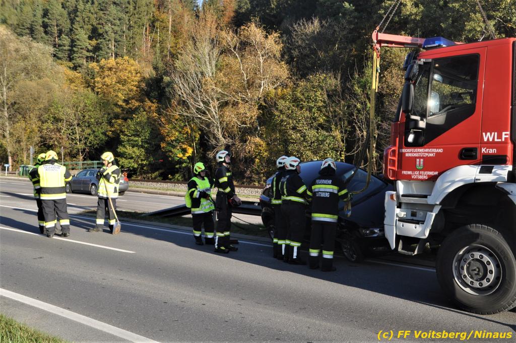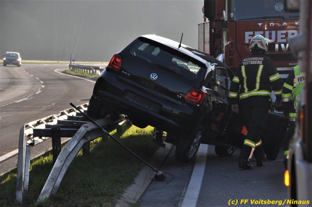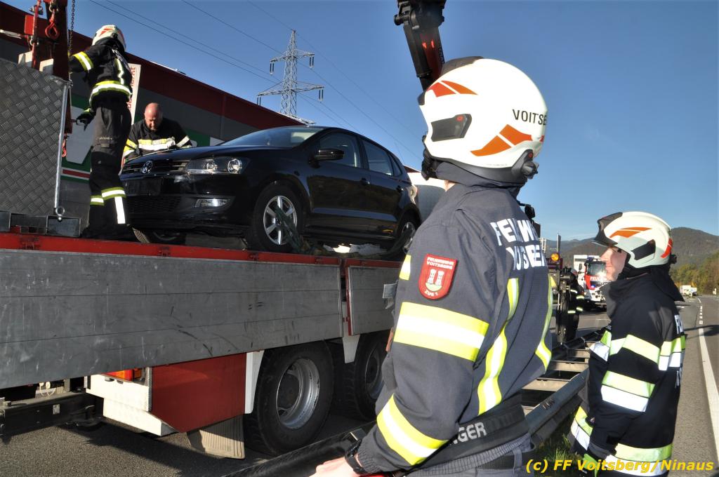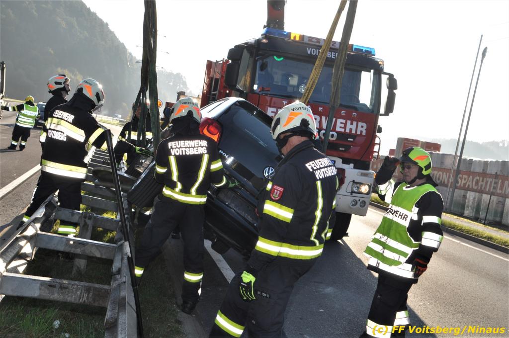 VOITSBERG, am 23.10.2019 Ein spektakulärer Unfall ereignete sich am Mittwoch, 23. Oktober um ca. 8 Uhr auf der B 70 in Rosental. Eine PKW-Lenkerin wurde auf der zweispurigen Richtungsfahrbahn nach Graz von der Sonne derart geblendet, dass sie die Orientierung verlor. Der PKW schlitterte mit der linken Seite auf die Mittelleitschiene, kippte nach rechts auf die Fahrbahn und dann wieder zurück auf die Leitschiene. Dadurch blockierte das Fahrzeug einen Fahrstreifen. Die Lenkerin blieb unverletzt hatte aber großes Glück, da sich die Stange eines Verkehrszeichens durch die Bodenplatte in den Kofferraum bohrte. Wäre dies einen Meter davor passiert, hätte es tragisch ausgehen können. Die alarmierte FF Rosental sicherte die Unfallstelle ab, regelte den Verkehr und band ausgeflossene Betriebsmittel. Zwecks Bergung und Abtransport auf einen gesicherten Platz wurde das WLF-Kran der FF Voitsberg nachalarmiert.