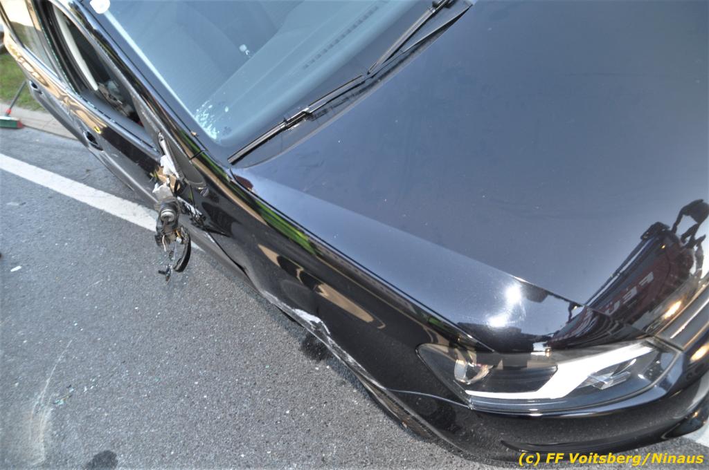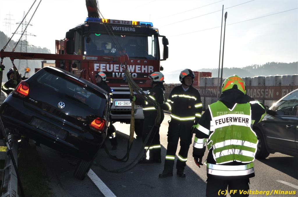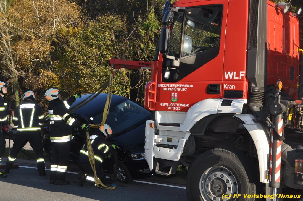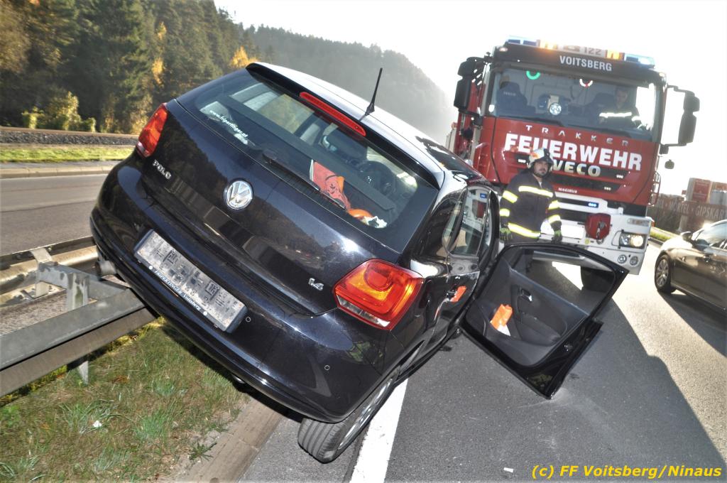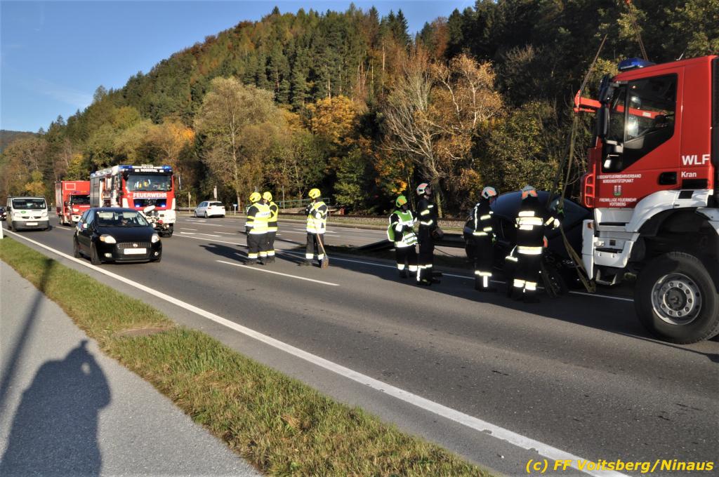 VOITSBERG, am 23.10.2019 Ein spektakulärer Unfall ereignete sich am Mittwoch, 23. Oktober um ca. 8 Uhr auf der B 70 in Rosental. Eine PKW-Lenkerin wurde auf der zweispurigen Richtungsfahrbahn nach Graz von der Sonne derart geblendet, dass sie die Orientierung verlor. Der PKW schlitterte mit der linken Seite auf die Mittelleitschiene, kippte nach rechts auf die Fahrbahn und dann wieder zurück auf die Leitschiene. Dadurch blockierte das Fahrzeug einen Fahrstreifen. Die Lenkerin blieb unverletzt hatte aber großes Glück, da sich die Stange eines Verkehrszeichens durch die Bodenplatte in den Kofferraum bohrte. Wäre dies einen Meter davor passiert, hätte es tragisch ausgehen können. Die alarmierte FF Rosental sicherte die Unfallstelle ab, regelte den Verkehr und band ausgeflossene Betriebsmittel. Zwecks Bergung und Abtransport auf einen gesicherten Platz wurde das WLF-Kran der FF Voitsberg nachalarmiert.