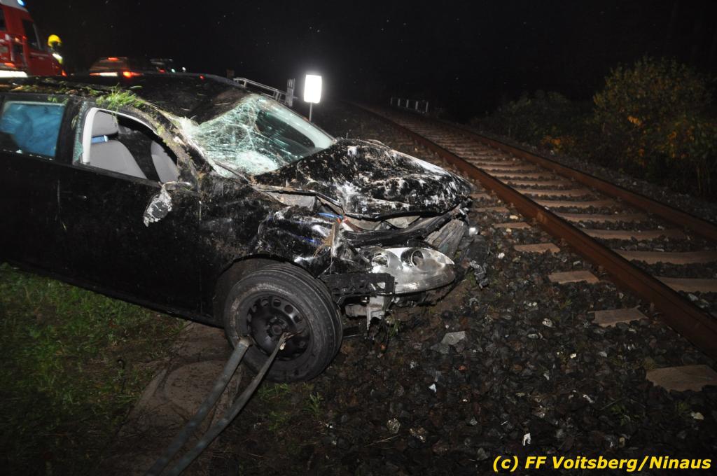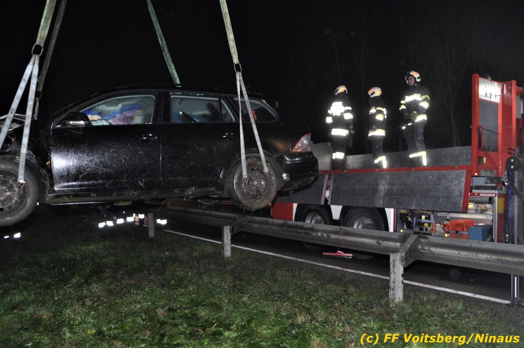 VOITSBERG, am 01.11.2019 Die FF Voitsberg wurde am Freitag, 1. November 2019 kurz nach 2 Uhr seitens der einsatzleitenden FF Krems zu einer Fahrzeugbergung in den Kremser Reihen Fahrtrichtung Graz in Voitsberg zwecks Unterstützung nachalarmiert. Ein von der B 70 abgekommener PKW geriet auf eine Leitschiene, wurde ca. 30 m durch die Luft geschleudert, überschlug sich einige Male und kam neben der Bahngleise der GKB zu stehen. Die Bergung erfolgte mit dem WLF-Kran der FF Voitsberg. Da Betriebsmittel aus dem schwer beschädigten Fahrzeug ausflossen, wurde dieser auf einen gesicherten Platz abgestellt. Der Lenker wurde mit Verletzungen unbestimmten Grades in ein Krankenhaus eingeliefert. Die FF Krems übernahm die Einsatzleitung, sicherte die Unfallstelle ab, baute einen Brandschutz auf, band ausgelaufene Betriebsmittel und sammelte herumliegende Wrackteile ein.
