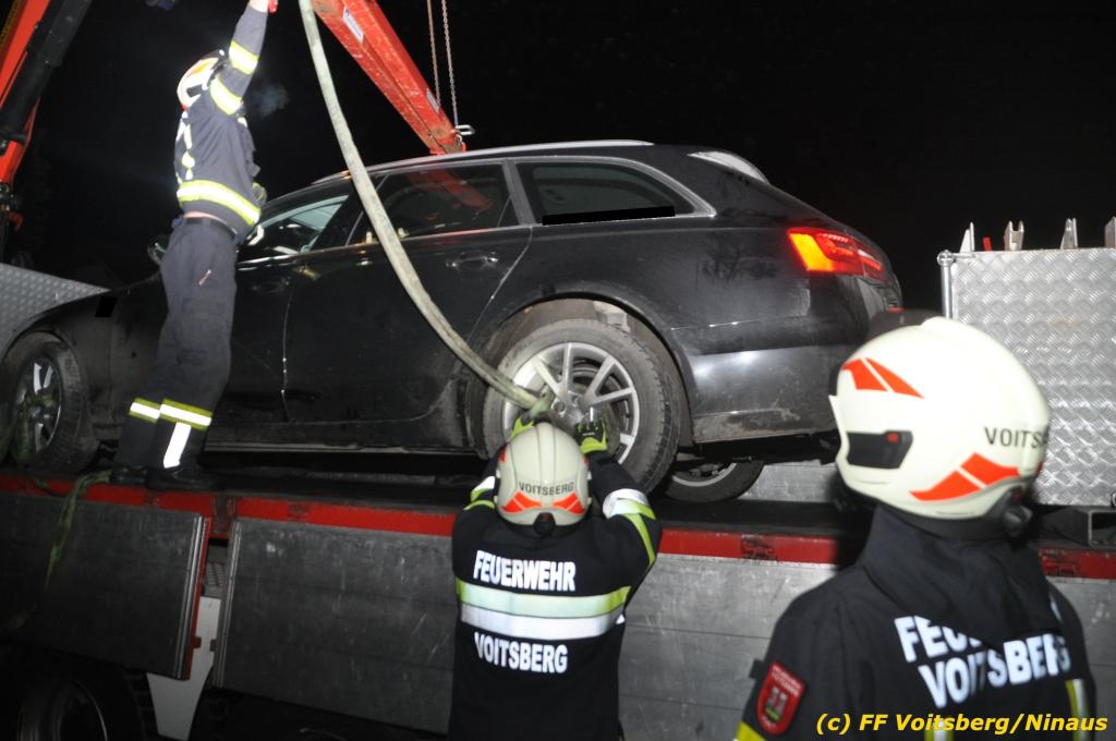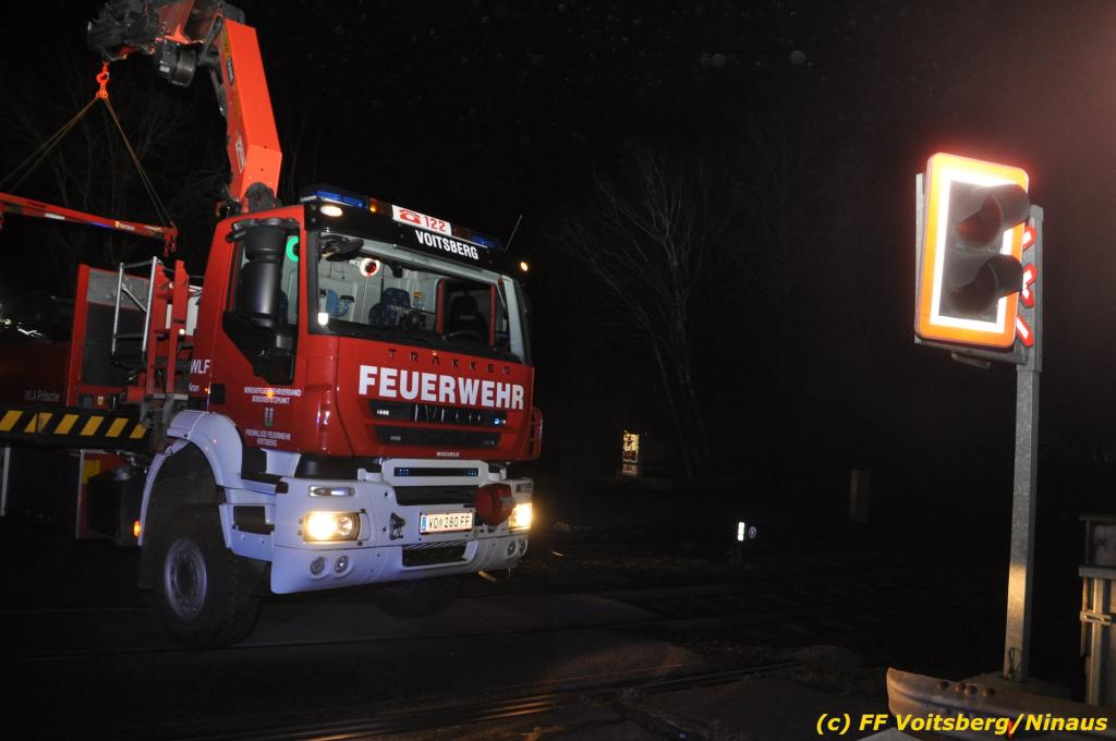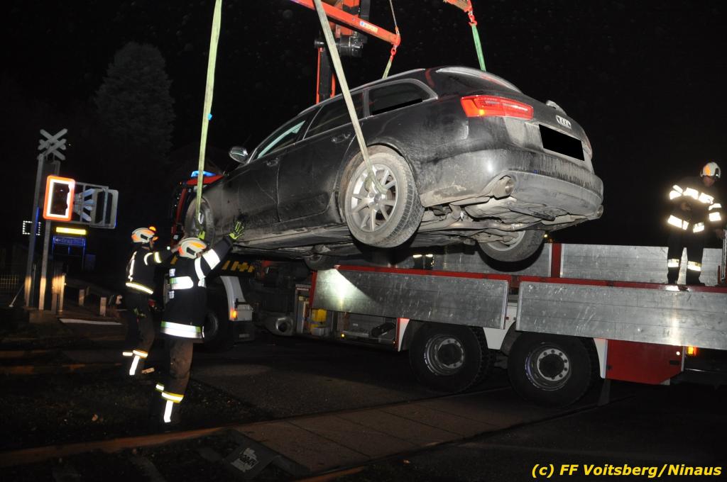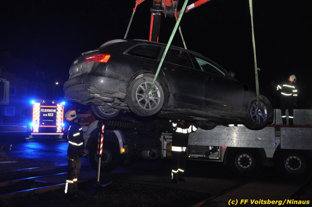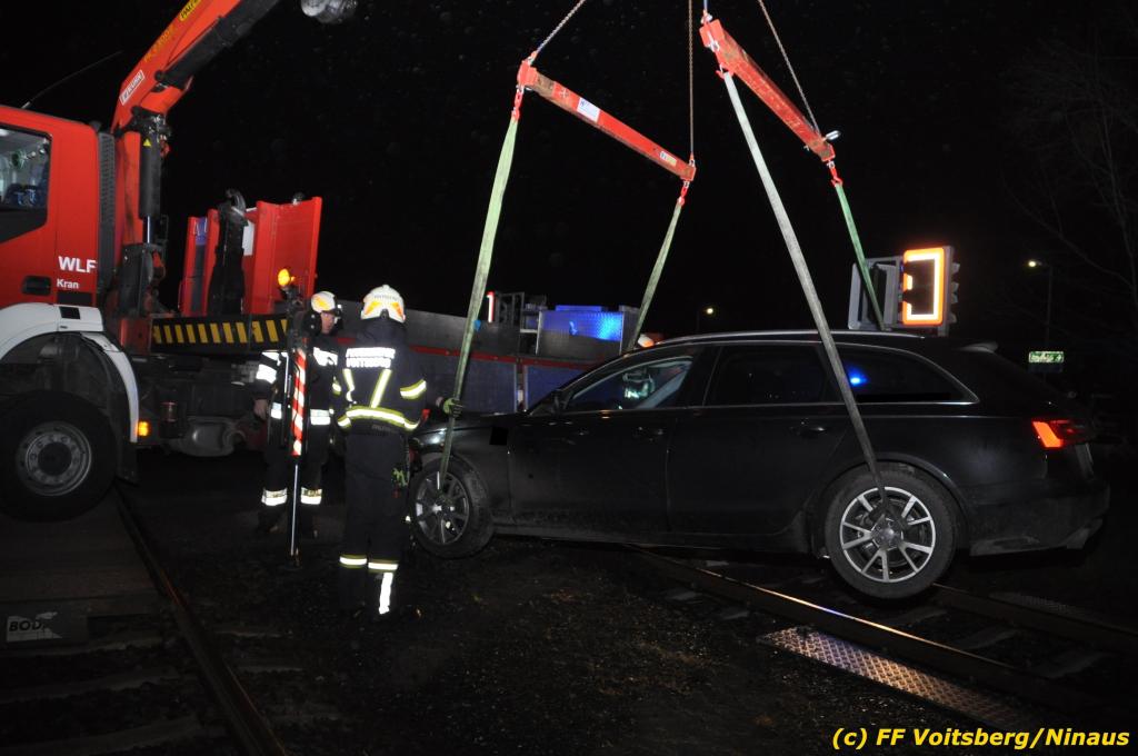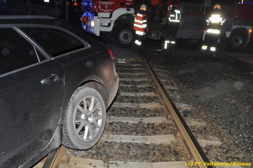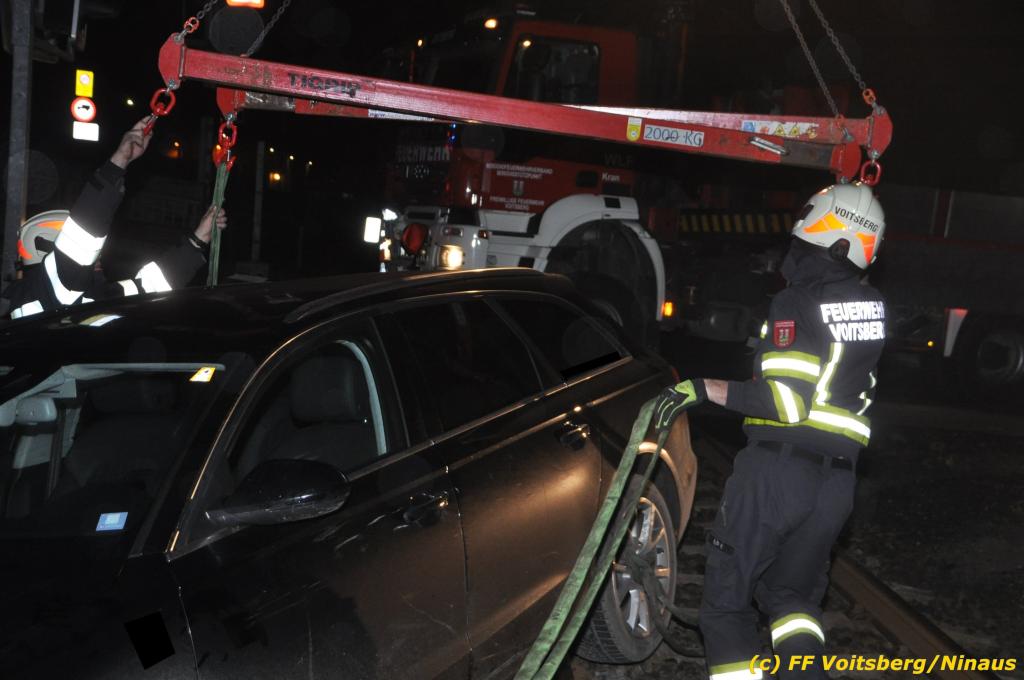 VOITSBERG, am 27.11.2019 Am Mittwoch, 27. November 2019 kam um ca. 1 Uhr ein Fahrzeuglenker mit seinem Fahrzeug bei der Bahnübersetzung in der Arnsteinstrasse in Voitsberg von der Gemeindestrasse ab und landete auf dem GKB-Bahngleis, wo es zu diesem Zeitpunkt zum Glück keinen Zugsverkehr gab. Das Fahrzeug schlitterte über die Gleise und kam mit dem Heck auf diesem zu stehen. Die alarmierte FF Voitsberg barg das leicht beschädigte Fahrzeug mittels dem WLF-Kran und brachte es zu einem gesicherten Abstellplatz. Verletzt wurde niemand. Zwecks Kontrolle des Gleiskörpers wurde der zuständige Mitarbeiter der GKB verständigt, welcher nach kleineren Arbeiten keine Schäden feststellen konnte. Die polizeilichen Erhebungen führten Beamte der PI Voitsberg durch. Eingesetzt waren 6 KameradInnen der FF Voitsberg, die Polizei mit 2 Beamten und der Inspektionsdienst der GKB mit einem Mitarbeiter. Text und Fotos: FF Voitsberg/Ninaus