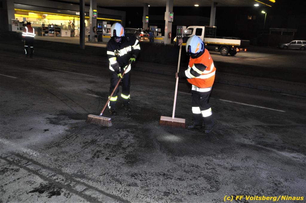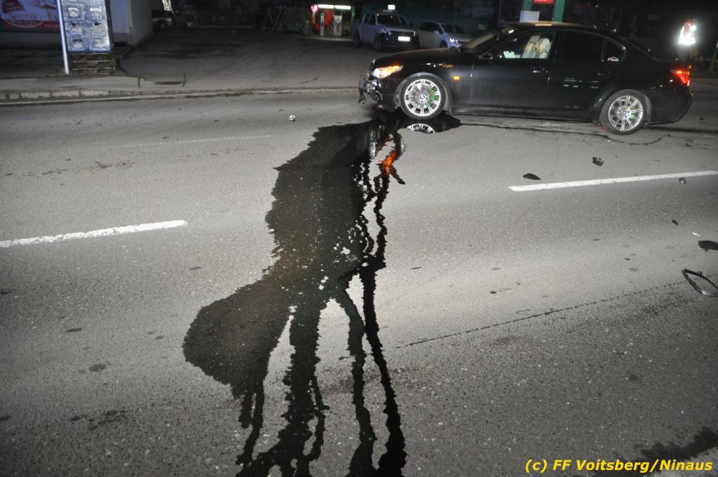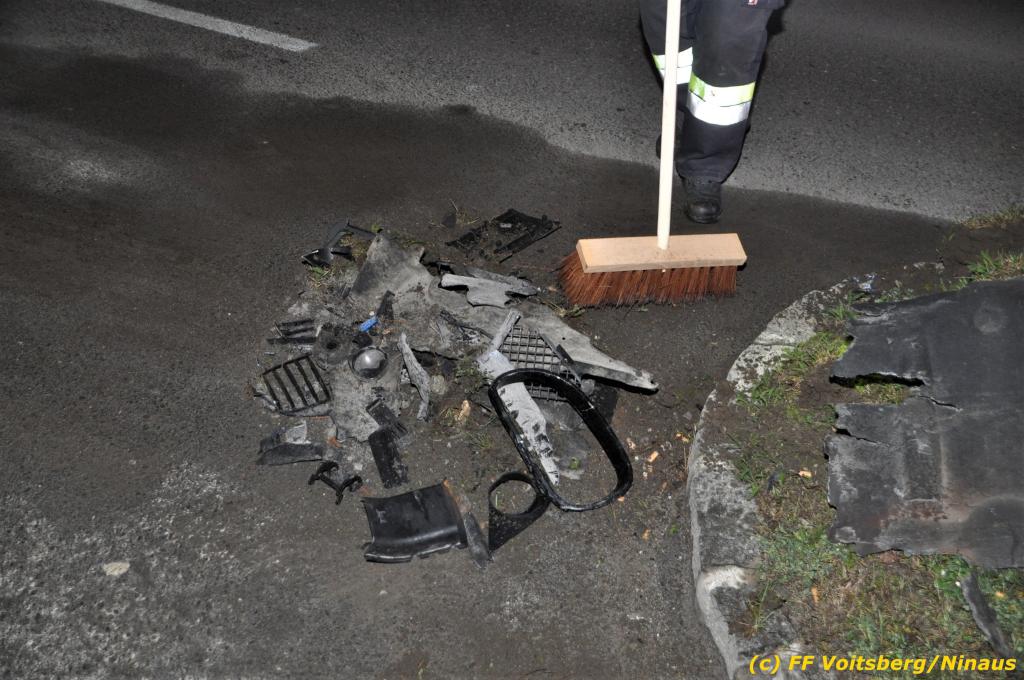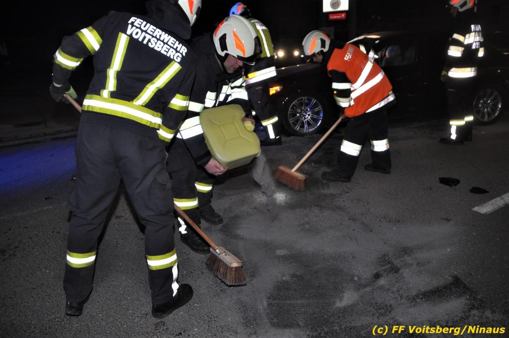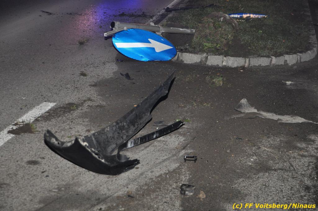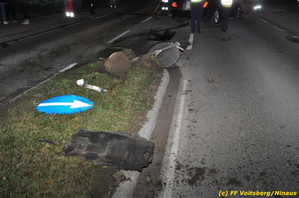 VOITSBERG, am 29.11.2019 Die FF Voitsberg wurde am Freitag, 29. November 2019 um 21:50 Uhr zu einem Verkehrsunfall in die Grazer Vorstadt in Voitsberg über die LLZ Steiermark alarmiert. Ein Pkw geriet auf eine Verkehrsinsel, beschädigte zwei Verkehrszeichen und kam nach ca. 40 m auf der Gemeindestraße zu stehen. Dabei gelangten Betriebsmittel auf die Fahrbahn und verunreinigten sie. Mit Bindemittel wurden diese gebunden und fachgerecht entsorgt. Herumliegende Wrackteile wurde eingesammelt und vom städtischen Bauhof abtransportiert. Das beschädigte Fahrzeug wurde mit vier Abschlepprollern von der Straße geschoben und abgestellt, sowie die Batterie abgeklemmt. Verletzt wurde niemand.