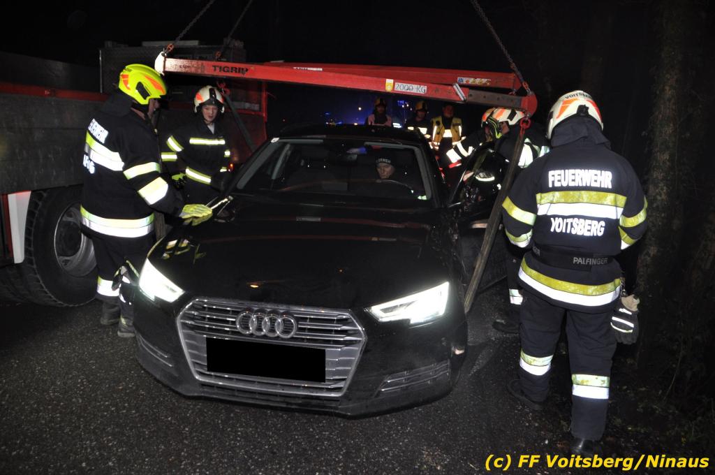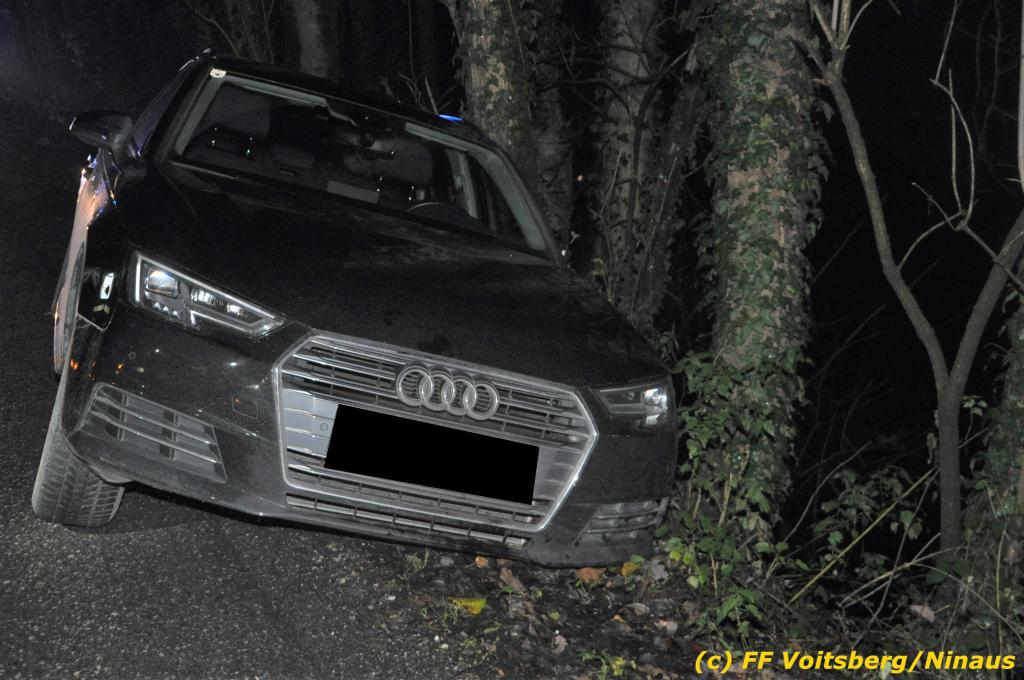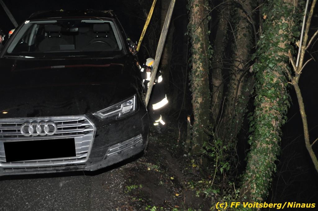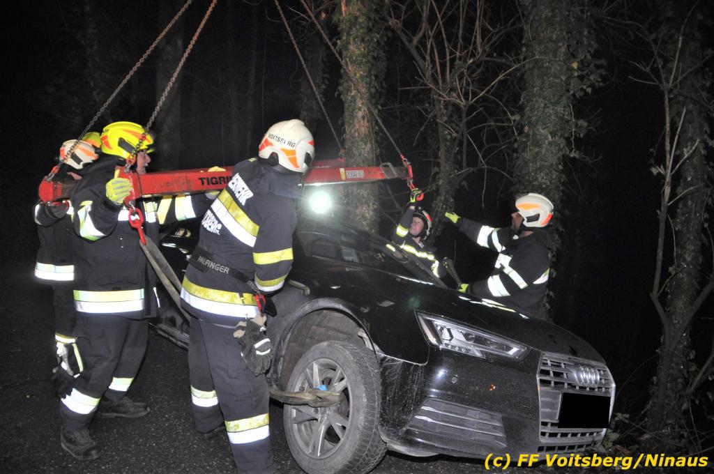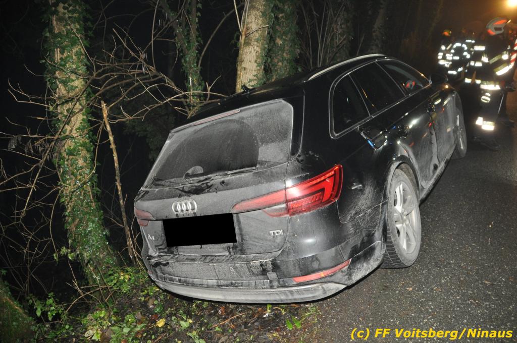 VOITSBERG, am 02.12.2019 In den Abendstunden des Montag, 2. Dezember 2019 kam ein Pkw auf der Lucknerstrasse in Bärnbach bergaufwärts fahrend links von Straße ab und blieb an einem Baum hängen. Die alarmierten Feuerwehren Bärnbach und Afling sicherten die Unfallstelle ab und alarmierten zwecks Bergung das WLF-Kran der FF Voitsberg, mit welchem der leicht beschädigte Pkw geborgen wurde ehe dieser dann die Fahrt auf eigener Achse fortsetzen konnte. Verletzt wurde niemand. .