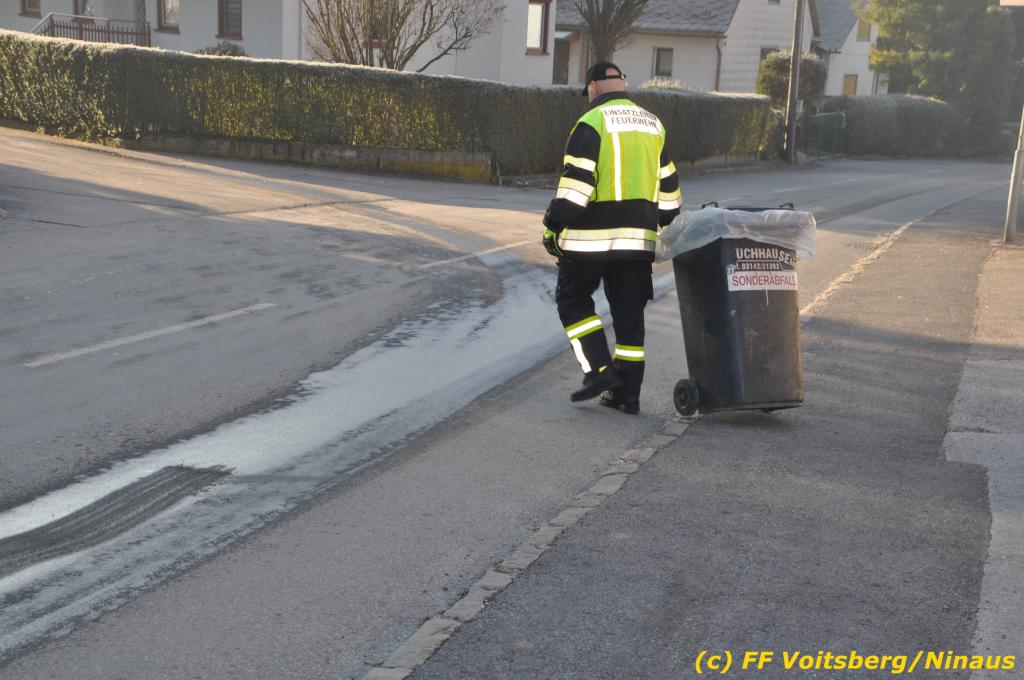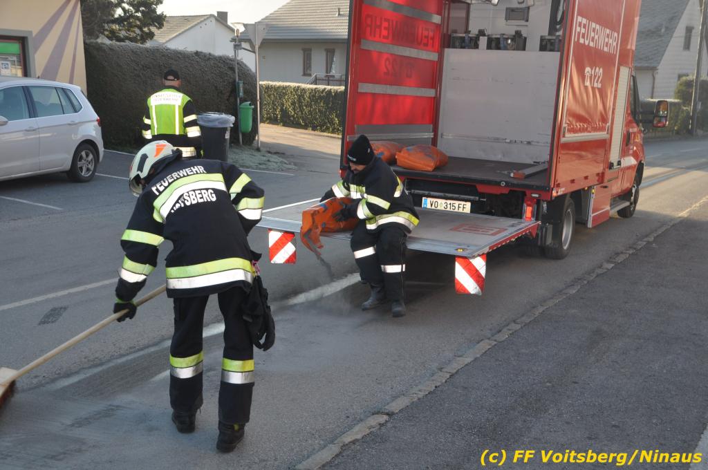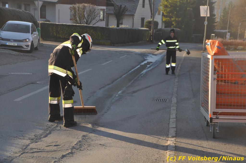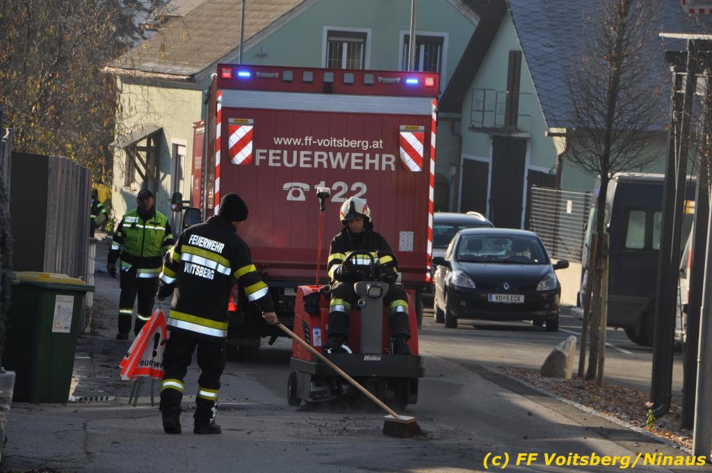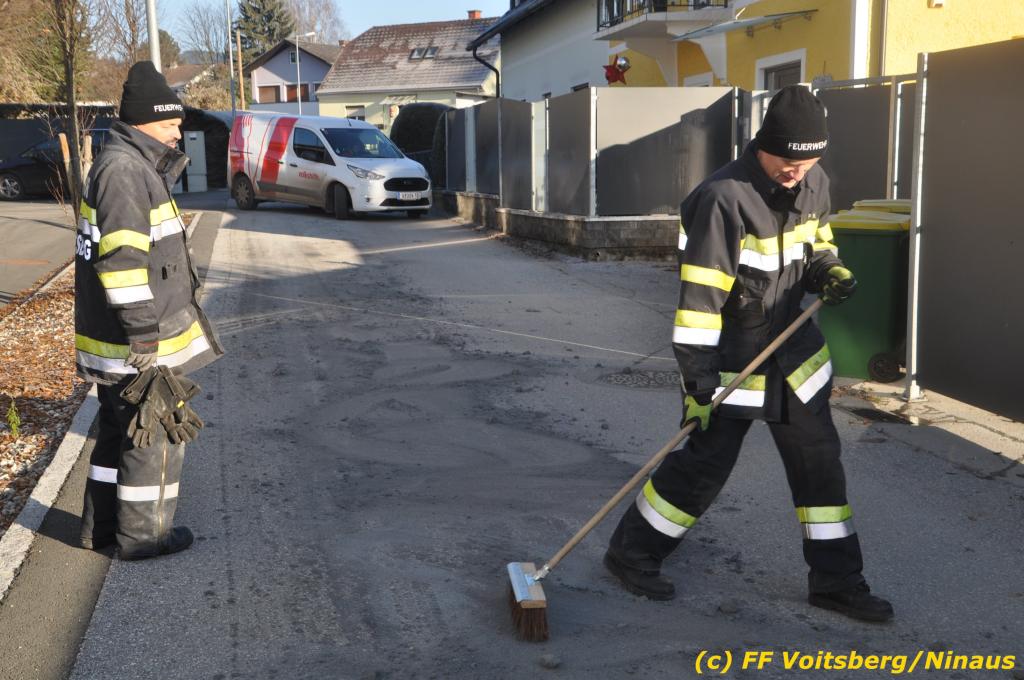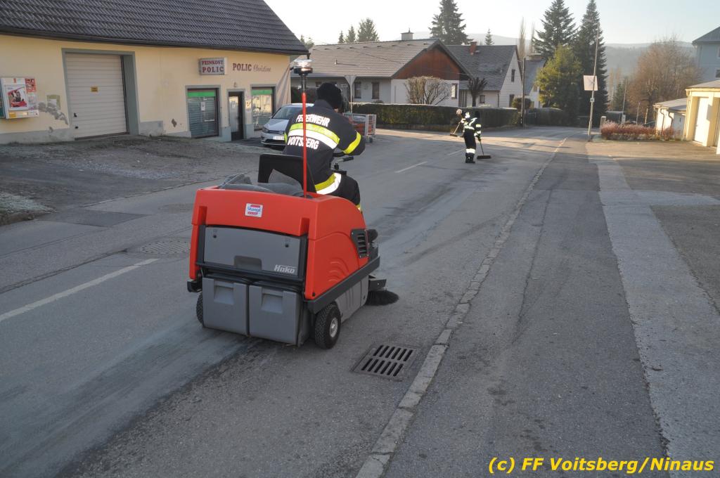 VOITSBERG, am 04.12.2019 Von einem Firmentransporter einer Baufirma gelangte am Mittwoch, 4. Dezember 2019 kurz nach 8 Uhr Dieseltreibstoff auf die Lacknergasse, Perschlerstrasse und Mozartgasse in Voitsberg. Ein mitgeführter Treibstoffkanister kippte auf der Ladefläche um und der auslaufende Diesel verunreinigte die Gemeindestrassen auf mehreren hundert Meter. Die alarmierte FF Voitsberg band die Betriebsmittel mittels Bindemittel und sammelte dieses mit einer feuerwehreigenen Kehrmaschine ein und entsorgte dieses. Unterstützt wurde die Feuerwehr von Mitarbeitern der Baufirma.