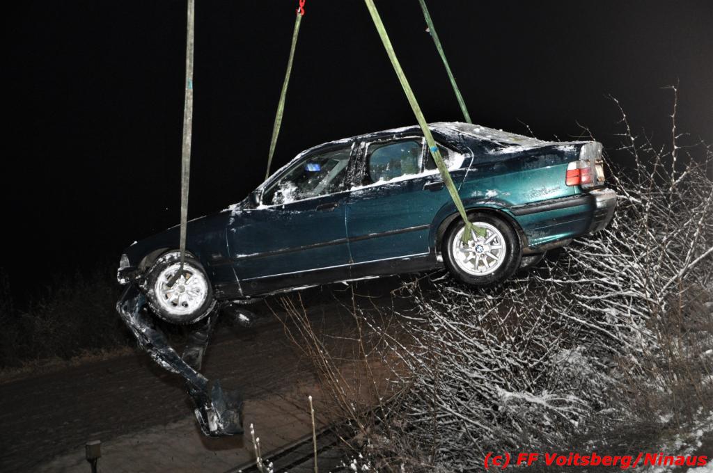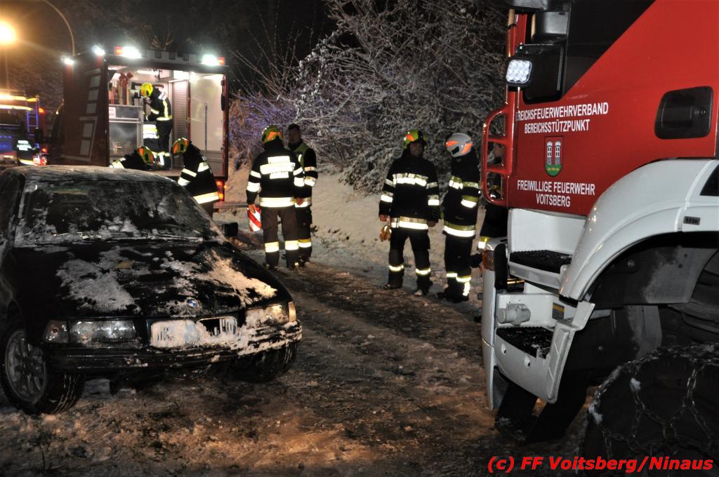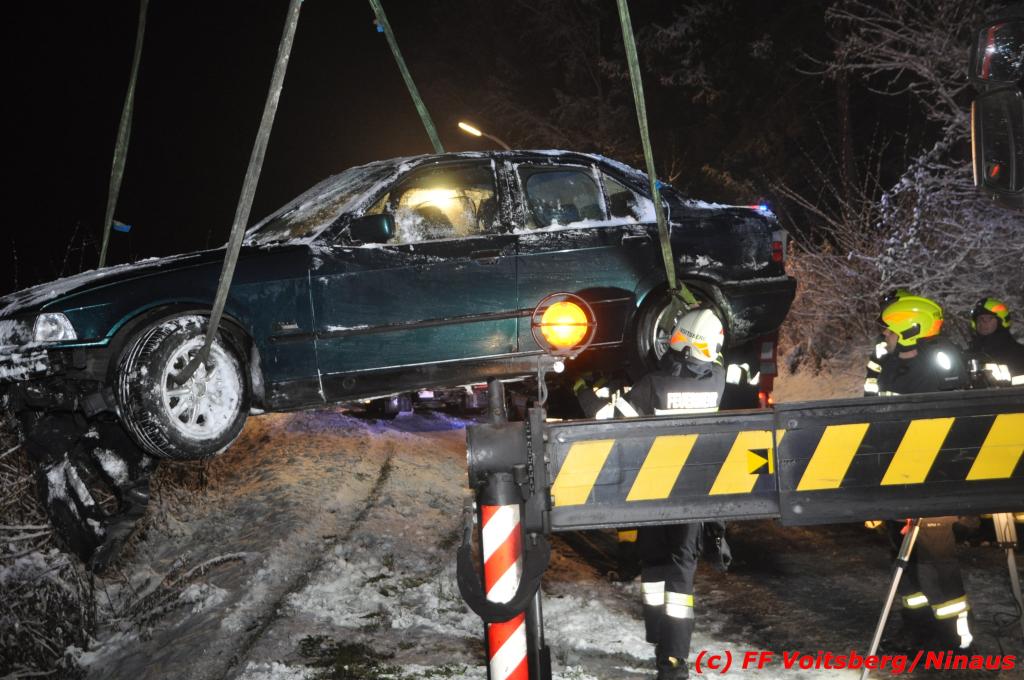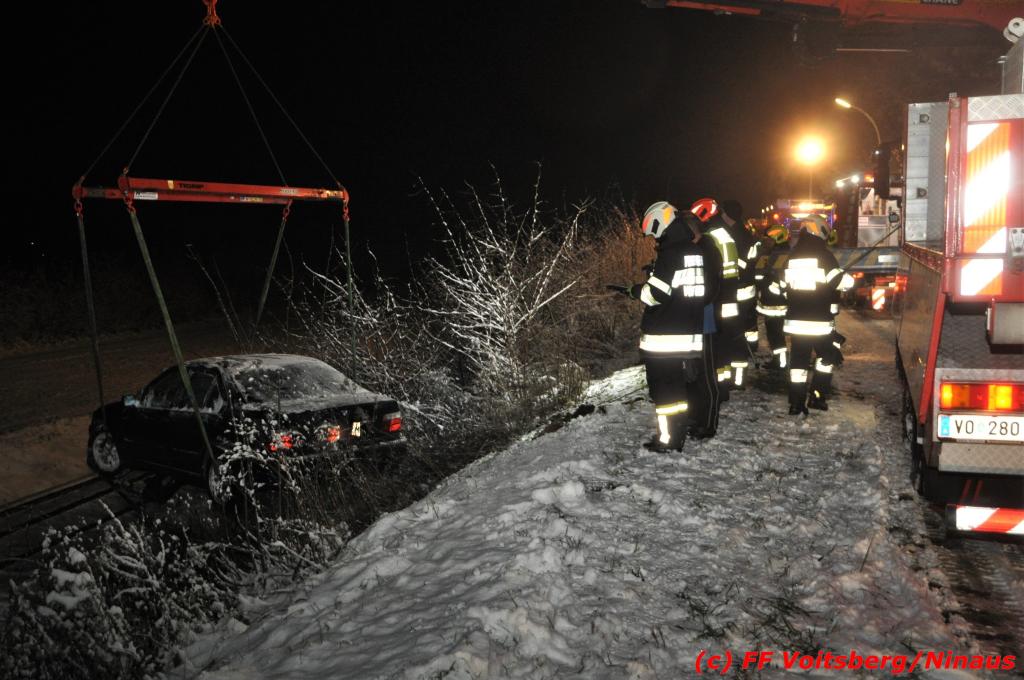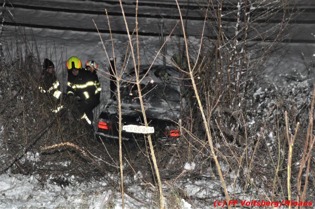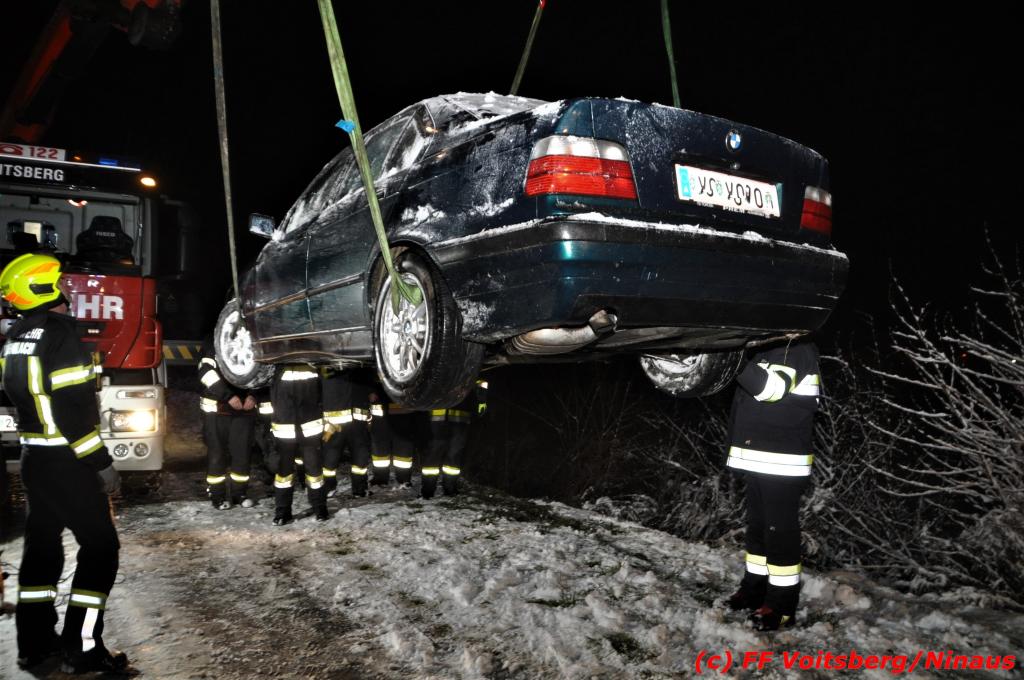 VOITSBERG, am 14.12.2019 Ein Pkw geriet am Samstag, 14. Dezember 2019 nach 1 Uhr auf der schneeglatten Fahrbahn der Marienschachtstraße in Bärnbach ab, fuhr über eine ca. 10 m hohe Böschung und kam kurz vor den Gleisen der GKB-Eisenbahn zu stehen. Dabei hatte der Lenker Glück, dass sich das Fahrzeug nicht überschlug und er unverletzt blieb. Zwecks Bergung wurde die zuständige FF Bärnbach seitens der LLZ Steiermark alarmiert, welche als Unterstützung nach Erkundung des Einsatzleiters das WLF-Kran der FF Voitsberg nachalarmieren ließ. Das leicht beschädigte Fahrzeug wurde geborgen und der Lenker konnte seine Fahrt auf eigener Achse fortsetzen.