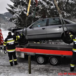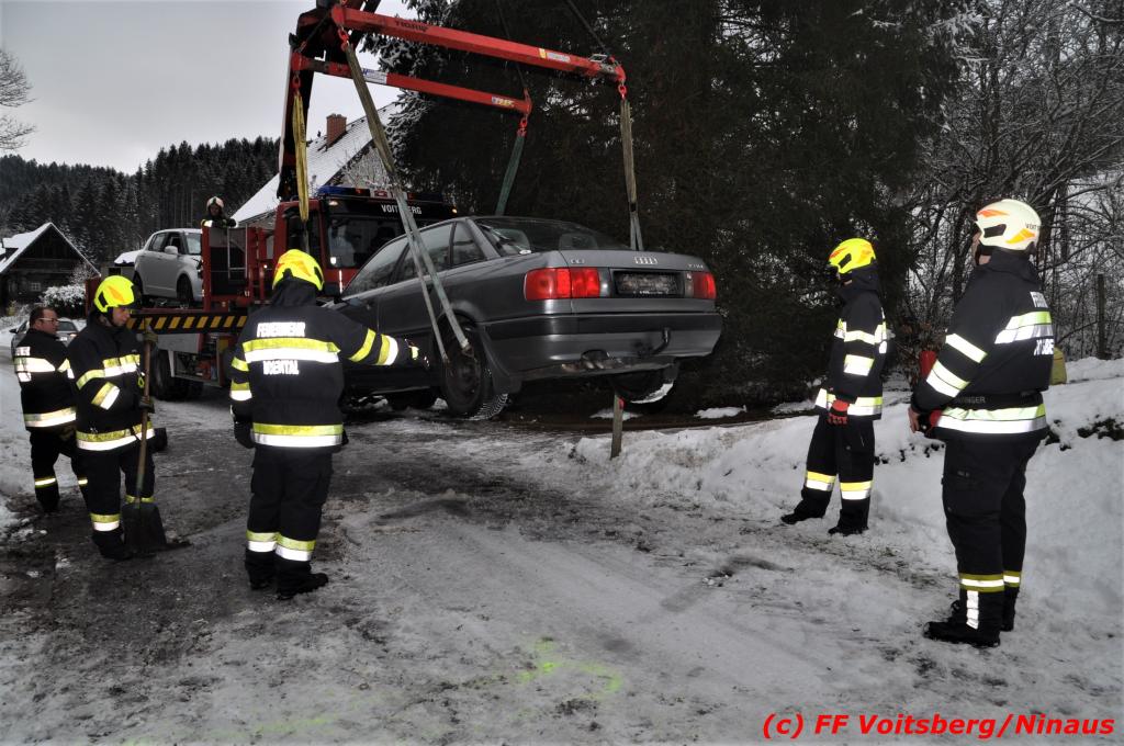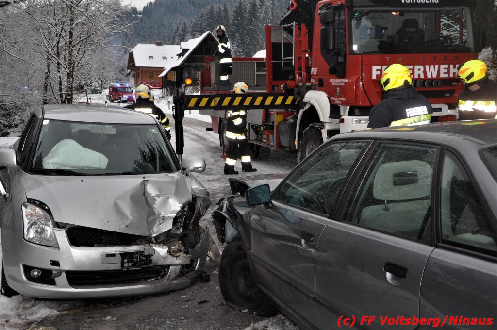 VOITSBERG, am 14.12.2019 Am Samstag, 14. Oktober 2019 in den Vormittagsstunden kam es aus unbekannter Ursache auf der schneeglatten Gößnitztalstraße im Gemeindegebiet Rosental zu einem Zusammenstoß zweier Pkw. Beide Fahrzeuge wurden schwer beschädigt und blockierten die Straße. Drei in den Fahrzeugen befindliche Personen wurden mit Verletzungen unbestimmten Grades in das LKH Voitsberg eingeliefert. Zwecks Bergung und Binden auslaufender Betriebsmittel wurde die FF Rosental seitens der LLZ alarmiert, welche nach Erkundung durch den Einsatzleiter zwecks Bergung beider Fahrzeuge das WLF-Kran der FF Voitsberg nachalarmieren ließ. Die FF Rosental sicherte die Unfallstelle ab, baute einen Brandschutz auf, regelte den Verkehr und band ausgelaufene Betriebsmittel. Beide Fahrzeuge wurden mit dem WLF-Kran und dem Mehrzweckanhänger der FF Voitsberg zu einem gesicherten Platz überstellt. .