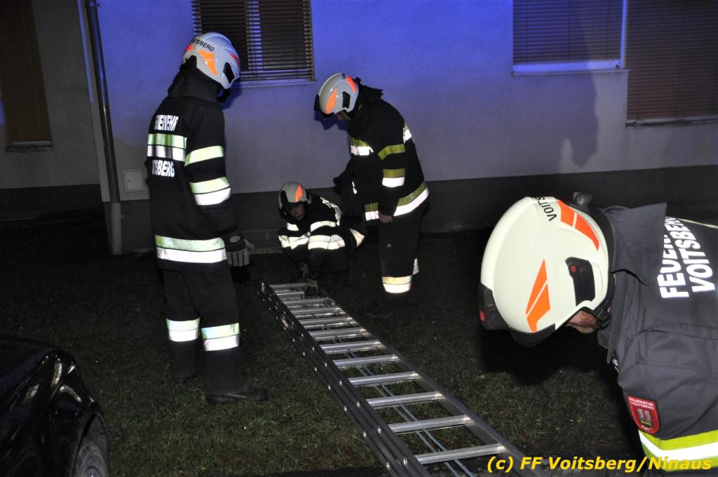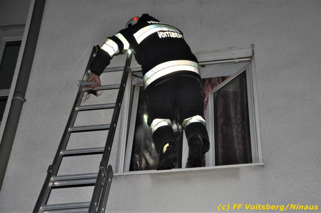 Daraufhin verständigte die Polizei die FF Voitsberg zwecks Türöffnung oder Fenstereinstieg und das Rote Kreuz Voitsberg-Köflach zwecks möglichem Sanitätseinsatz an. Bei Erkundung der Einsatzstelle durch den Einsatzleiter wurde ein gekipptes Fenster gesichtet, woraufhin ein Feuerwehrkamerad über den Leiterweg zuerst das Fenster öffnete und daraufhin in die Wohnung im 1. Stock einstieg und keine Person anfand.