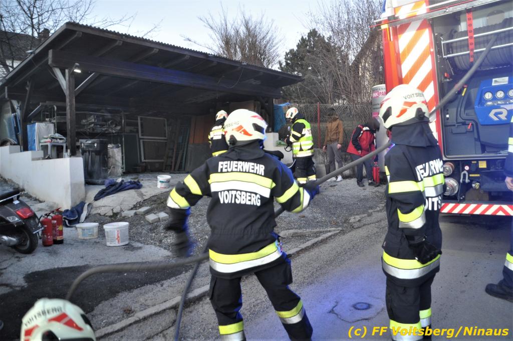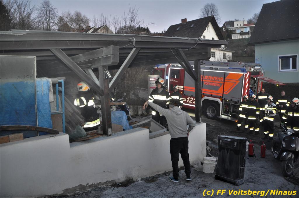 VOITSBERG, am 11.01.2020 Die FF Voitsberg wurde am Samstag, 11. Jänner 2020 um 16:25 Uhr zu einem Brand in die Franz-Schöpfer-Gasse in Voitsberg alarmiert. Ein Hausbesitzer bemerkte einen Kleinbrand in seinem vom Haus getrennten Carport. Mit insgesamt 5 Feuerlöschern versuchte er vergeblich, den Brand zur Gänze zu löschen. .