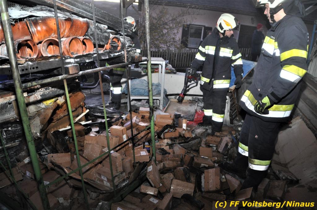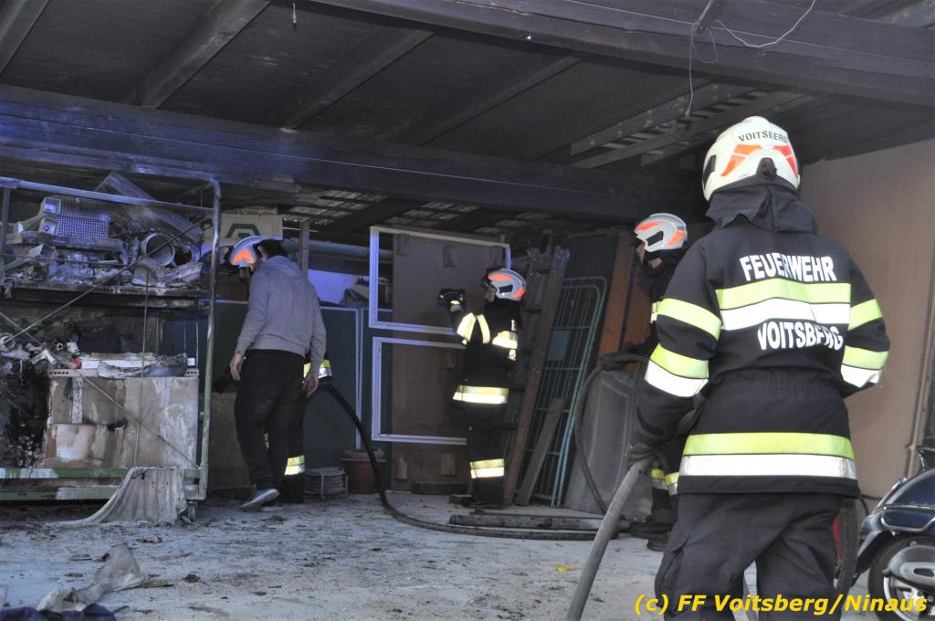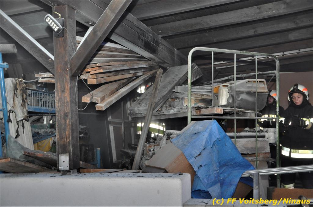 Er alarmierte die FF Voitsberg, welche unter Einsatz eines Hochdruckrohres den Brand rasch unter Kontrolle bringen konnte. Gelagertes Material, welches zum Versand vorbereitet war, und das Dach des Objektes wurden teilweise beschädigt