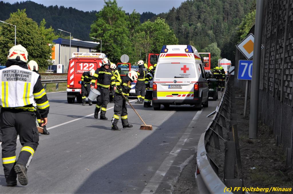 VOITSBERG, am 29.05.2020 Auf der Umfahrungsstraße Voitsberg kam es am Freitag, 29. Mai 2020 in den Nachmittagsstunden zu einem Zusammenstoß zwischen einem LKW und einem PKW. Die Lenkerin des PKW kollidierte seitlich mit einem in Richtung Graz fahrenden LKW. Der PKW wurde ca. 40m entlang der Leitschiene vom LKW mitgeschleift. Die Lenkerin als auch der LKW-Fahrer blieben unverletzt.