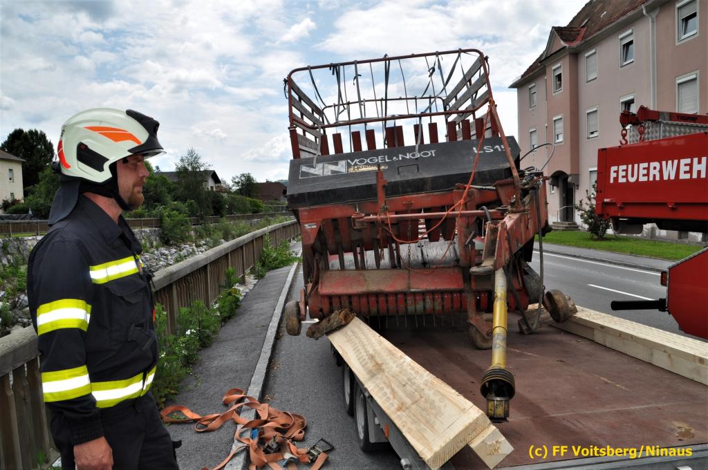 Mit dem WLF-Kran der FF Voitsberg wurde das landwirtschaftliche Gerät geborgen und zu einem Abstellplatz transportiert. Die FF Voitsberg richtete während der Bergungsarbeiten eine Umleitung über die Bahnhofstraße ein und reinigte die Straße von herumliegenden Wrackteilen.