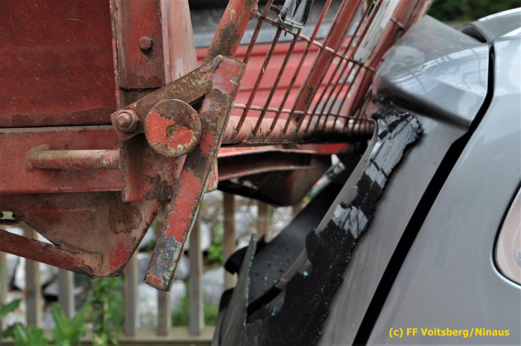 Bei der Kreuzung Arnsteinstrasse – Bahnhofstraße in Voitsberg kam ein Pkw auf das in Richtung Umfahrung Ost fahrende Gefährt trotz Stopptafel entgegen. Der Pkw-Lenker musste sein Fahrzeug durch eine Schnellbremsung zum Stillstand bringen, um einen Frontalzusammenstoß zu vermeiden. Dabei rutschte das am Anhänger befindliche Ladegut trotz Sicherung nach vor und prallte gegen das Heck des Zugfahrzeuges, welches beschädigt wurde.