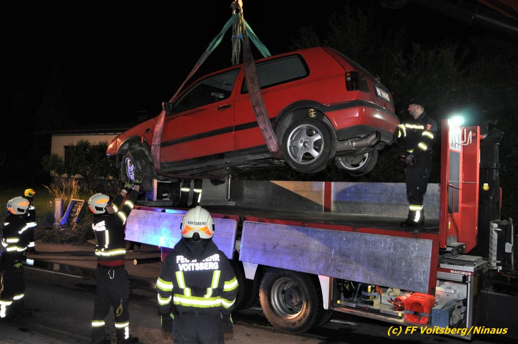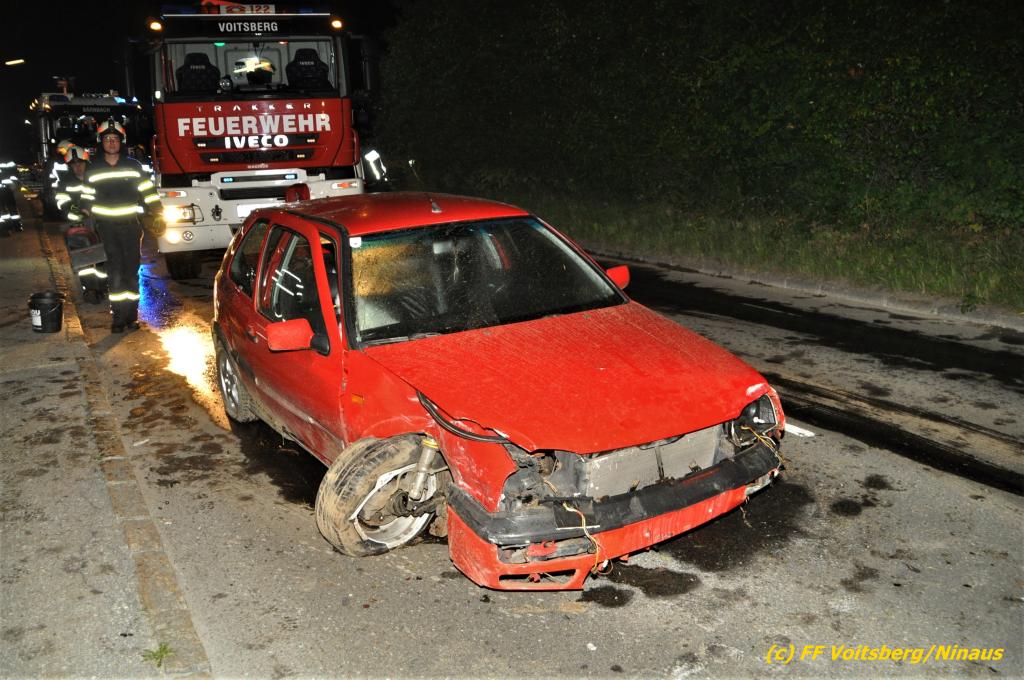 VOITSBERG, am 19.06.2020 Die Feuerwehren Bärnbach und Afling wurden am Freitag, 19. Juni 2020 kurz nach 21 Uhr zu einem Verkehrsunfall auf der L 341 nach Bärnbach (Ortsteil Klein-Kainach) alarmiert. Ein Pkw-Lenker kam mit seinem Fahrzeug Richtung Kainach fahrend auf die linke Straßenseite, touchierte einen Verteilerkasten und eine Gartenmauer, ehe es ihn wieder auf die Straße zurückschleuderte.