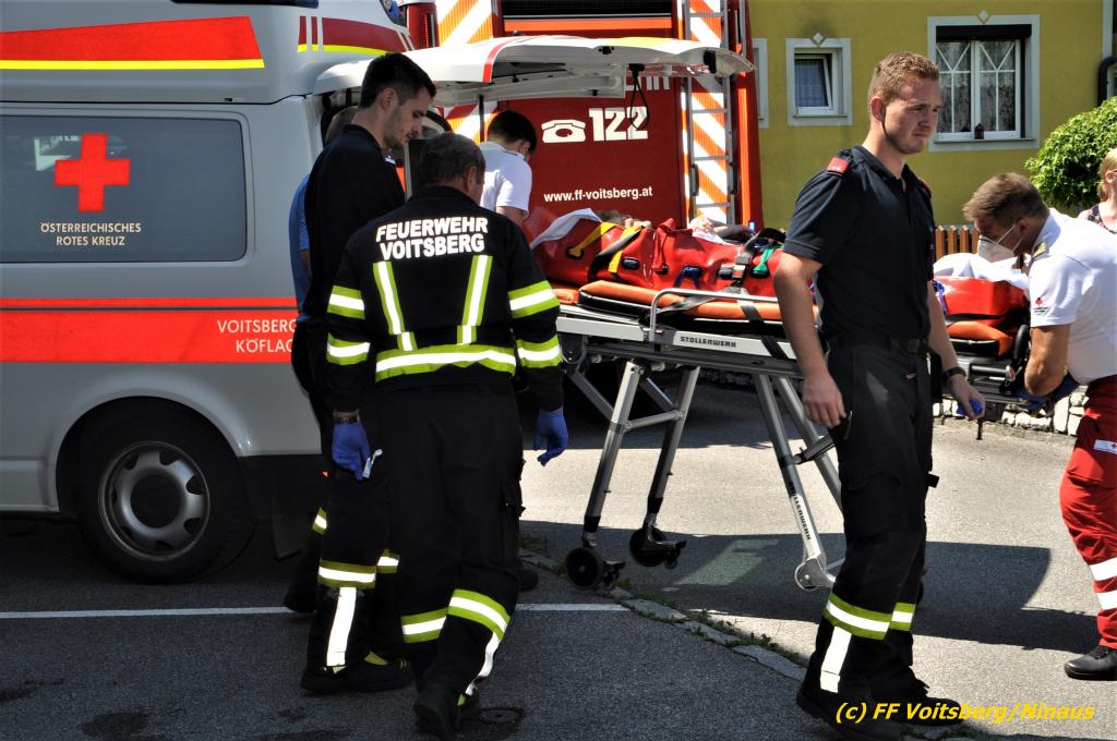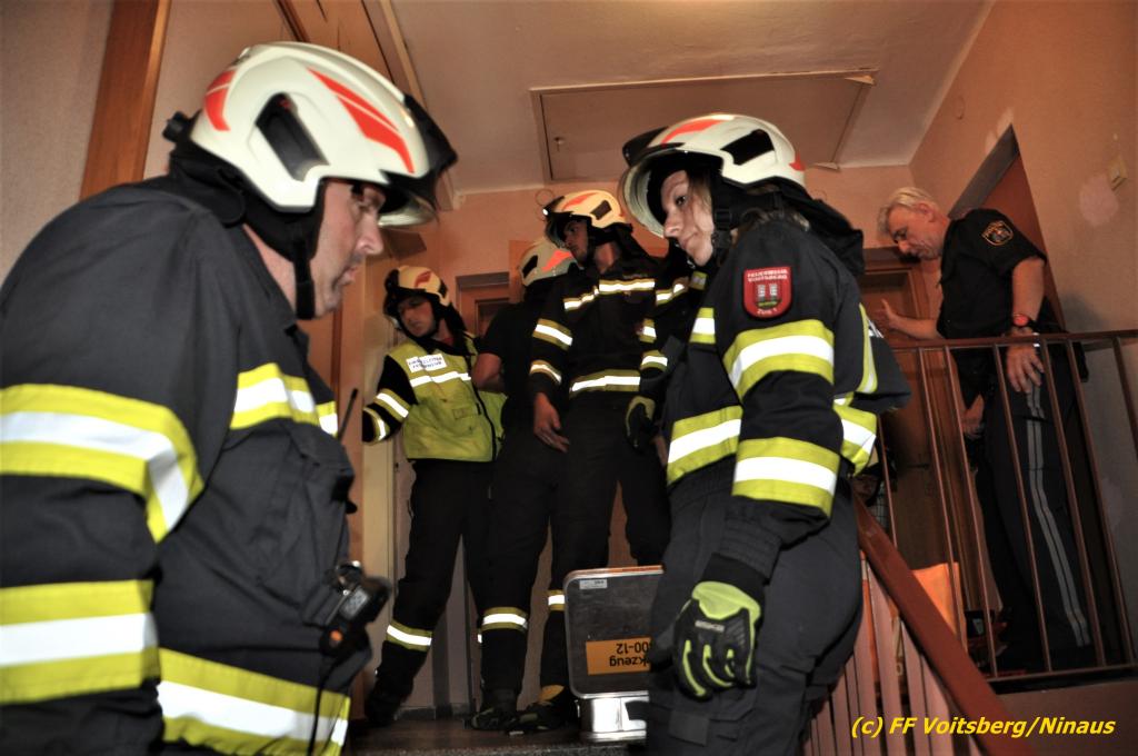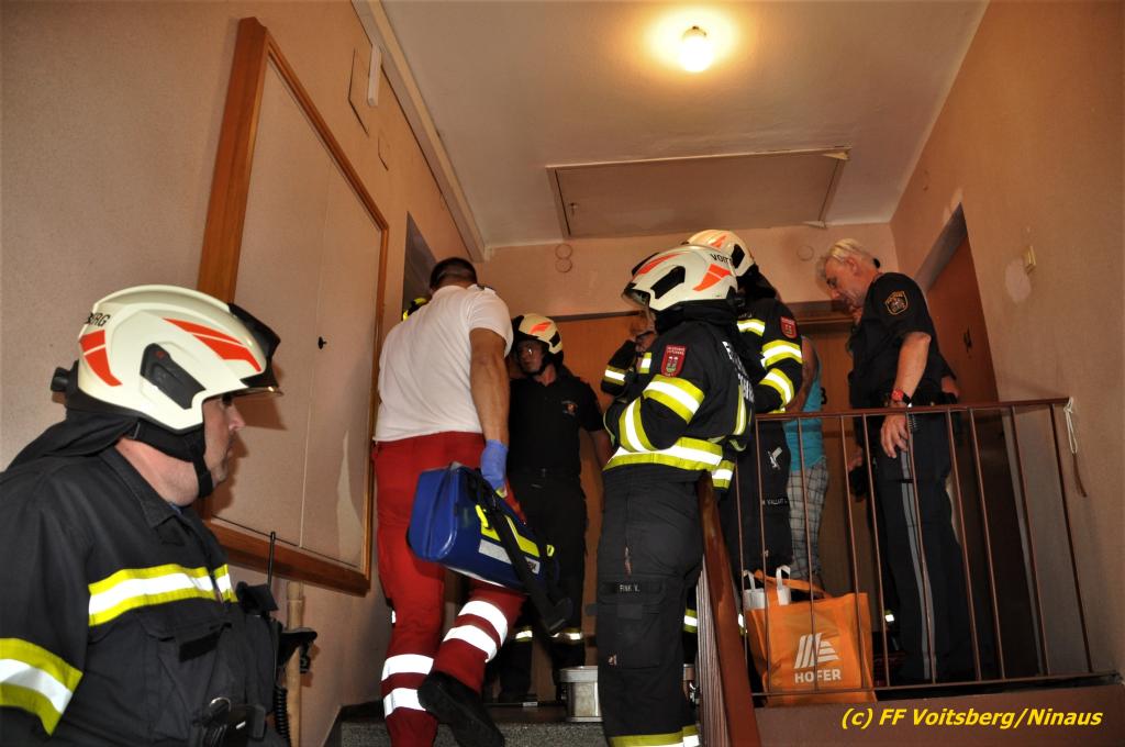 Der FF Voitsberg gelang durch Abschneiden der Türkegel und dem Entfernen der Türe der Zutritt in die Wohnung für das Rote Kreuz und die Polizei. Die Sanitäter versorgten die unbestimmten Grades verletzte Person und brachten sie in Zusammenarbeit mit der FF Voitsberg zum Rettungswagen. Sie wurde anschließend zur weiteren Behandlung in das LKH Voitsberg eingeliefert.