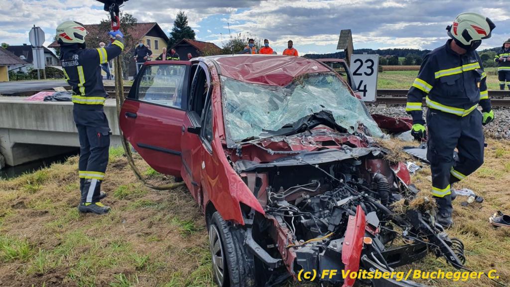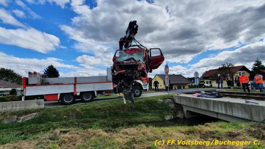 VOITSBERG, am 30.09.2020 Nach einem Zusammenstoß zwischen einem Pkw und einer Triebwagengarnitur der GKB wurde das schwer beschädigte Fahrzeug nach Anforderung der einsatzleitenden Feuerwehr Söding mit dem WLF-Kran geborgen und zu einem gesicherten Platz gebracht.