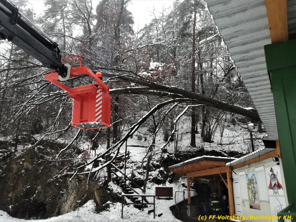 Die alarmierte FF Voitsberg kürzte den Baum unter Verwendung des WLF-Korb scheibchenweise, sodass größerer Schaden verhindert werden konnte.