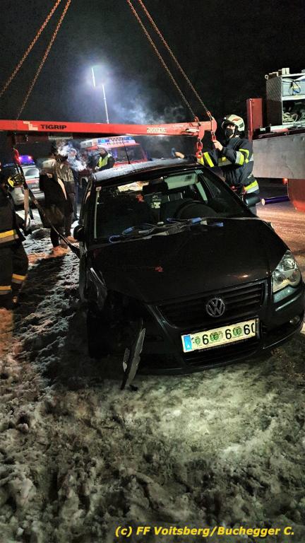 Eine Fahrzeuglenkerin kam vermutlich aufgrund der eisglatten Fahrbahn ins Schleudern und prallte gegen die Leitschiene. Das schwer beschädigte Fahrzeug wurde mit dem WLF-K geborgen und an einem gesicherten Ort abgestellt. Die beiden Fahrzeuginsassen blieben glücklicherweise unverletzt.