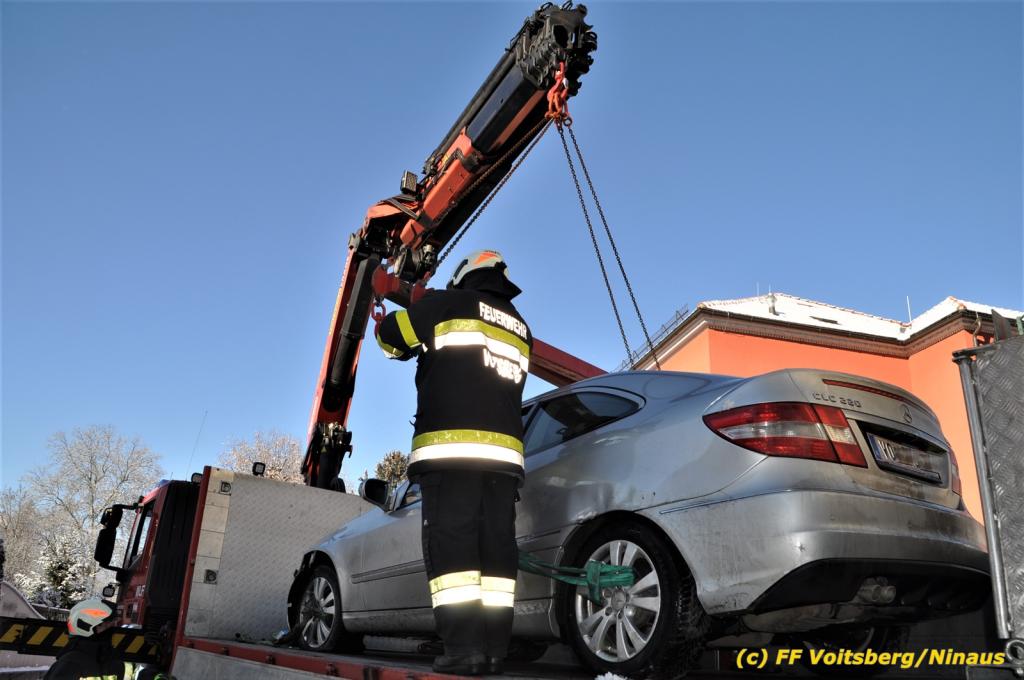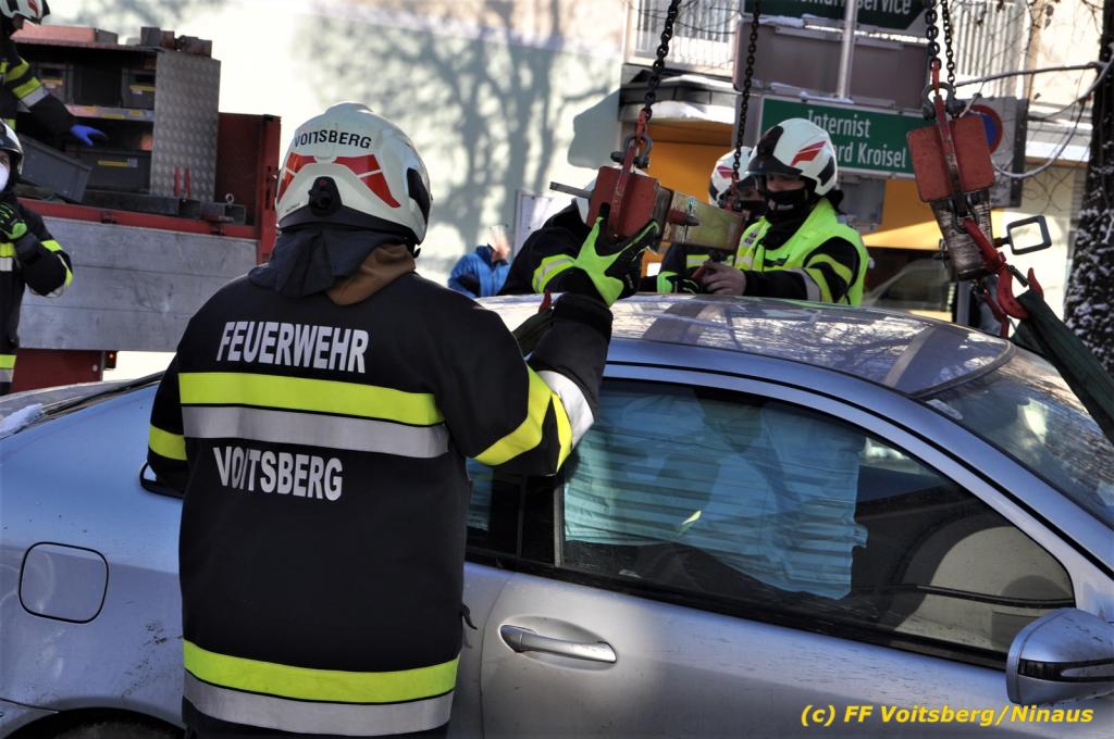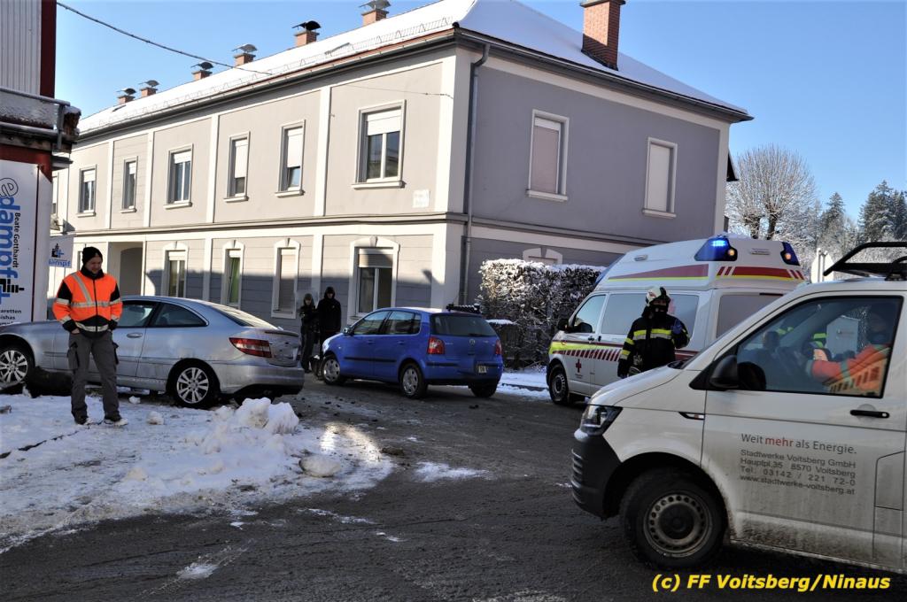 Zwei Pkw stießen an der Kreuzung zusammen, wobei ein Fahrzeug schwer beschädigt wurde und mit dem WLF-Kran von der Unfallstelle gebracht werden musste. Das leicht beschädigte zweite Fahrzeug wurde händisch auf einen Parkplatz geschoben. Schwer beschädigt wurde auch ein Strom-Verteilerkasten der Stadtwerke Voitsberg, welcher von Kräften der Stadtwerke gesichert wurde.