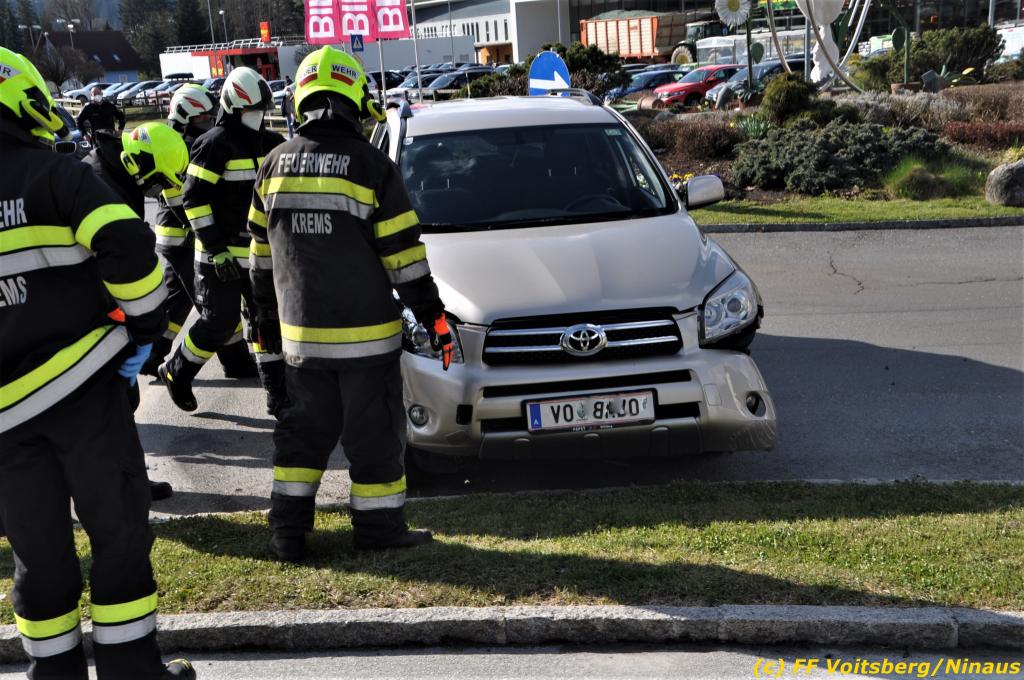 VOITSBERG, am 15.04.2021 Am Donnerstag, 15. April 2021 um ca. 9 Uhr geriet ein Pkw beim Kreisverkehr Blue Sky in Voitsberg gegen einen in der Grünanlage des Kreisverkehrs aufgestellten Stein, kippte zur Seite und blieb auf der Fahrbahn im Kreis liegen.