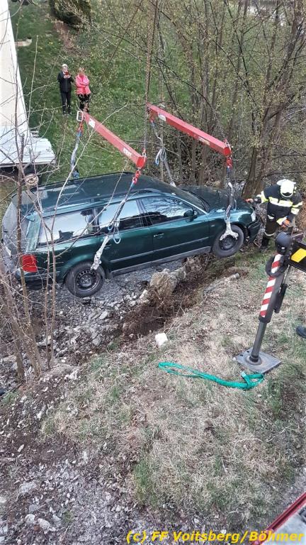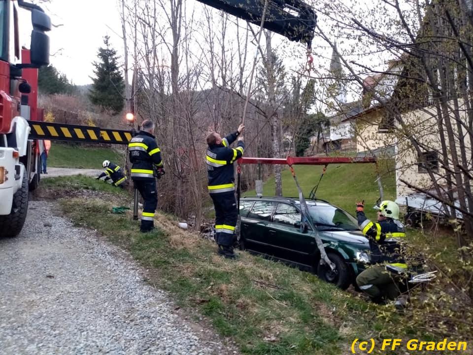 VOITSBERG, am 15.04.2021 Die FF Voitsberg wurde am Donnerstag, 15. April 2021 um 18:28 Uhr von der einsatzleitenden Feuerwehr Graden zu einer Fahrzeugbergung mit dem WLF-Kran alarmiert.