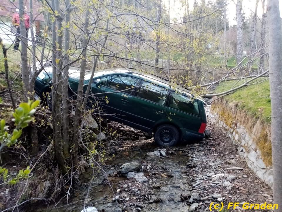Ein Pkw rollte aus unbekannten Gründen über einen Abhang in einen Bach und kam dort zu stehen.