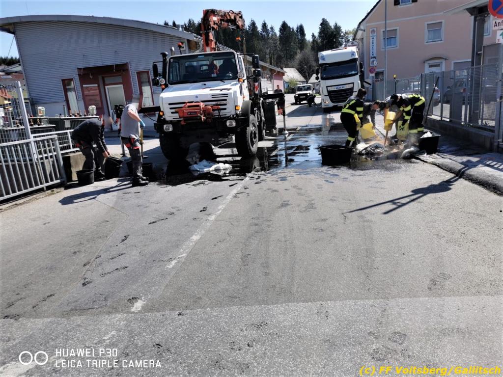 Zwecks Unterstützung wurden die Feuerwehren Hallersdorf und Mooskirchen alarmiert, welche in ihren Einsatzbereichen ebenfalls Ölsperren anbrachten. Seitens der Behörde wurde der Ölalarmdienst des Landes Steiermark verständigt, welcher auch die weiteren Maßnahmen anordnete. Eine Spezialfirma saugte das getränkte Bindemittel ab und entsorgte dieses fachgerecht. Die Schadenshöhe ist unbekannt. Der Einsatz dauerte ca. 6 Stunden.