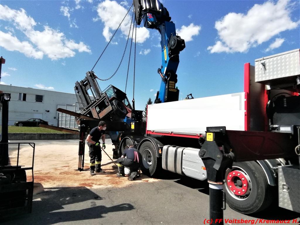 VOITSBERG, am 23.04.2021 Nachdem an einem Lkw-Kran nach einem technischen Gebrechen bei Verladearbeiten Hydrauliköl austrat, wurde die FF Voitsberg am Freitag, 23. April 2021 um 14:28 Uhr zu einem Schadstoffeinsatz in die Grazer Vorstadt in Voitsberg alarmiert.