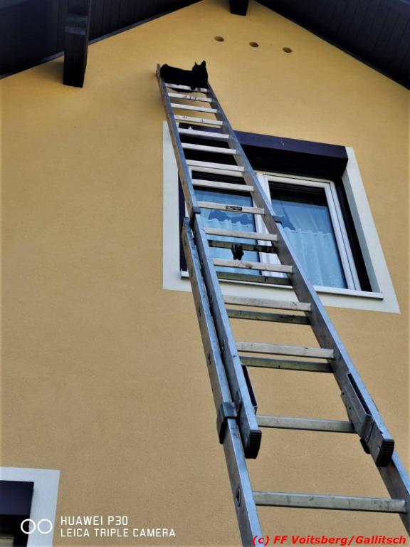 VOITSBERG, am 03.06.2021 Nachdem sich eine Katze über ein Dach am auf einen Dachvorsprung am Donnerstag, 3. Juni 2021 kurz vor Mittag verstieg, war sie hilflos dort gefangen.