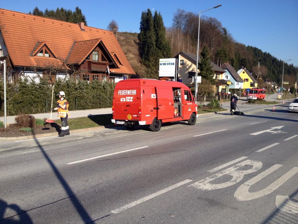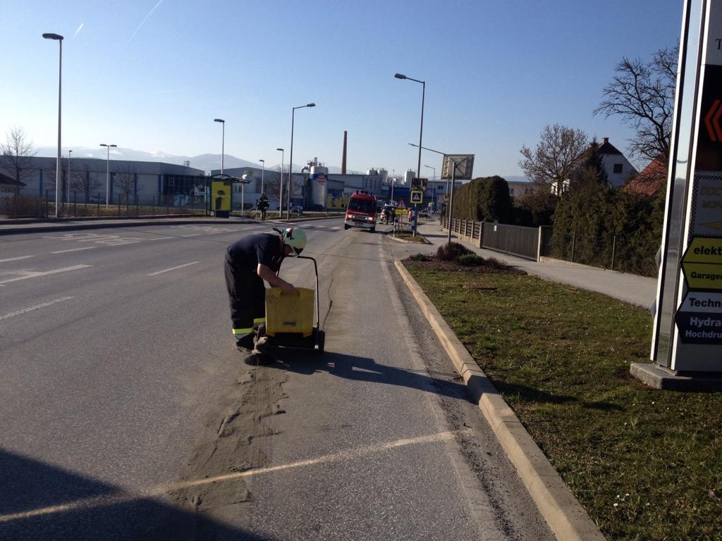 Eine ca. 600 Meter lange Ölspur wurde mit Bindemittel gebunden und die Straße mittels Warnschildern gesichert.