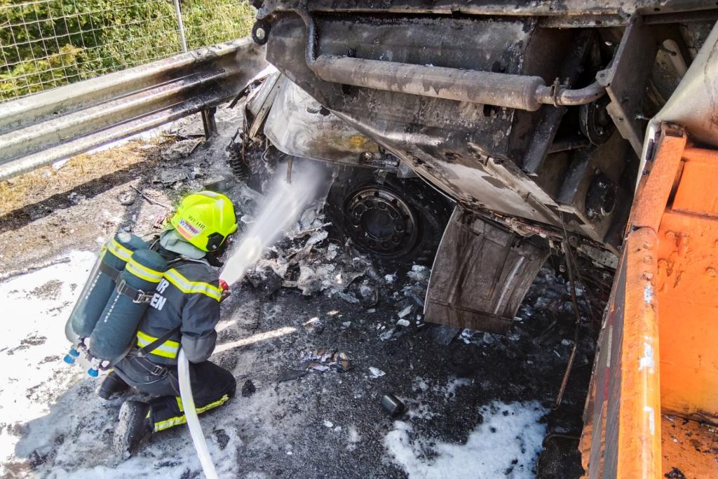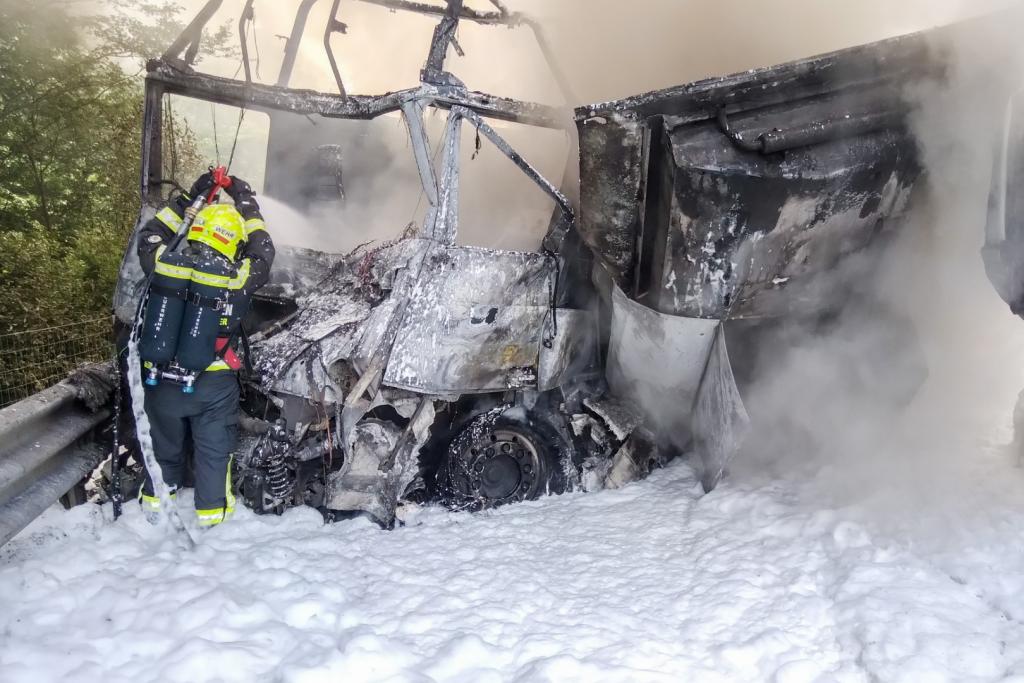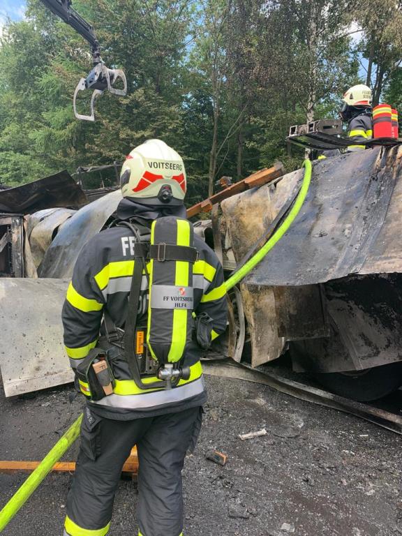 Aus bisher noch ungeklärter Ursachen fuhr ein Lenker eines Sattelschleppers auf einen LKW der Asfinag auf, die gerade in einem abgesicherten Bereich mit Mäharbeiten beschäftigt waren. Nachkommende Zivilpersonen versuchten mit Feuerwehrlöschern den Brand zu löschen und befreiten den Lenker des Sattelschleppers aus seinem Fahrzeug. Beim Eintreffen der Einsatzkräfte stand der Sattelschlepper bereits im Vollbrand.