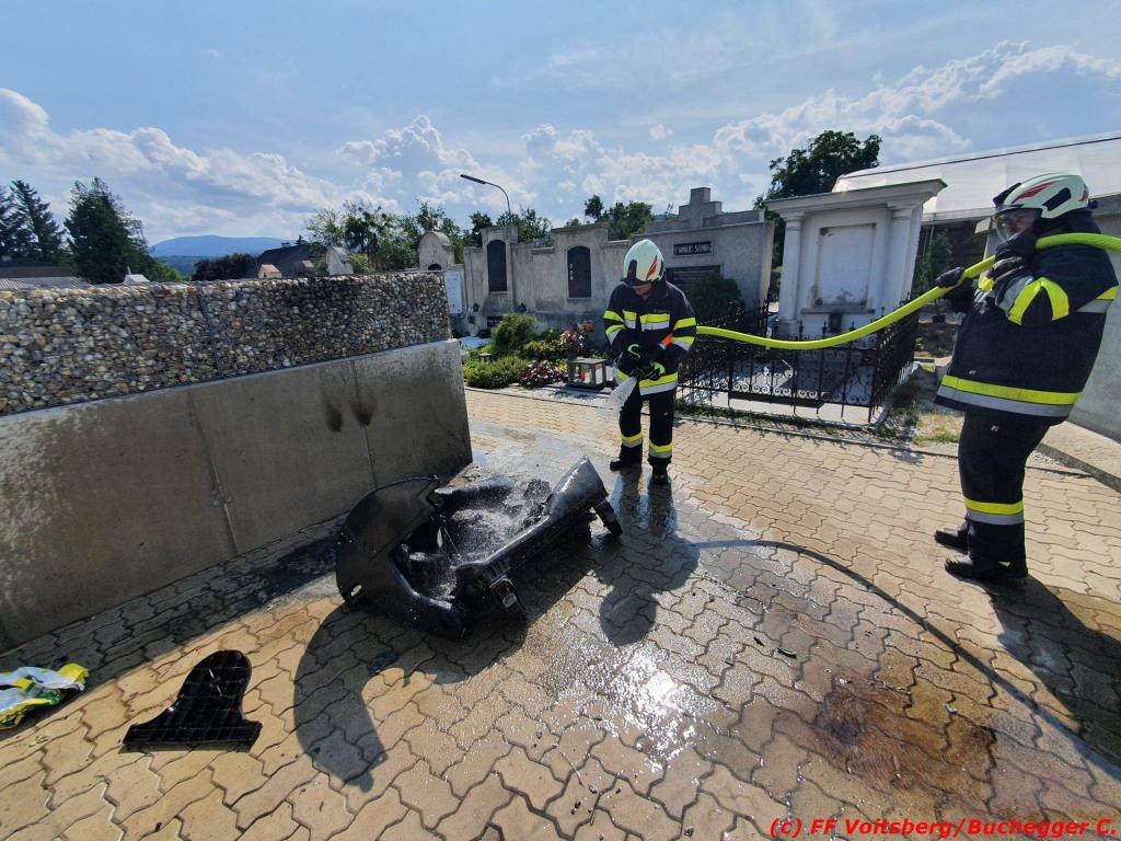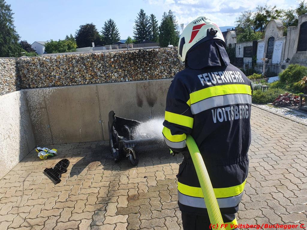 VOITSBERG, am 21.08.2021 Im Areal des Friedhofes Voitsberg geriet aus unbekannten Gründen ein Müllcontainer in Brand und brannte total aus. Die FF Voitsberg führte Nachlöscharbeiten durch.