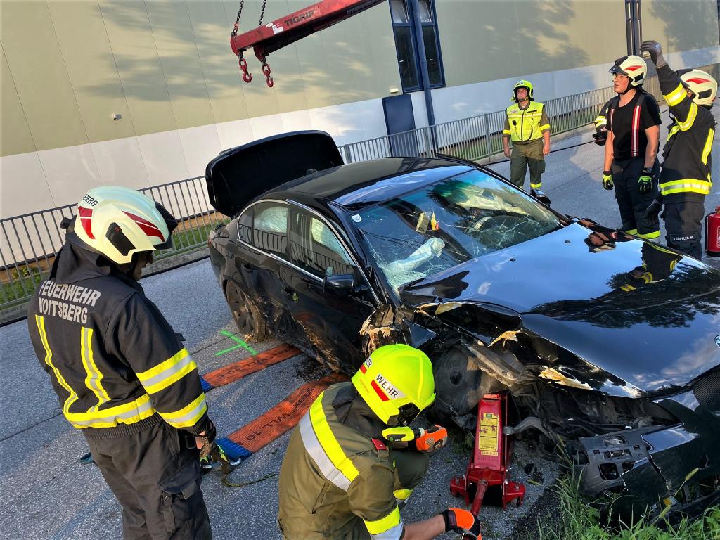 VOITSBERG, am 27.08.2021 Nach einem Zusammenstoß zweier Pkw wurde einer nach Anforderung der einsatzleitenden FF Krems mittels WLF-Kran geborgen und an einem gesicherten Platz abgestellt.