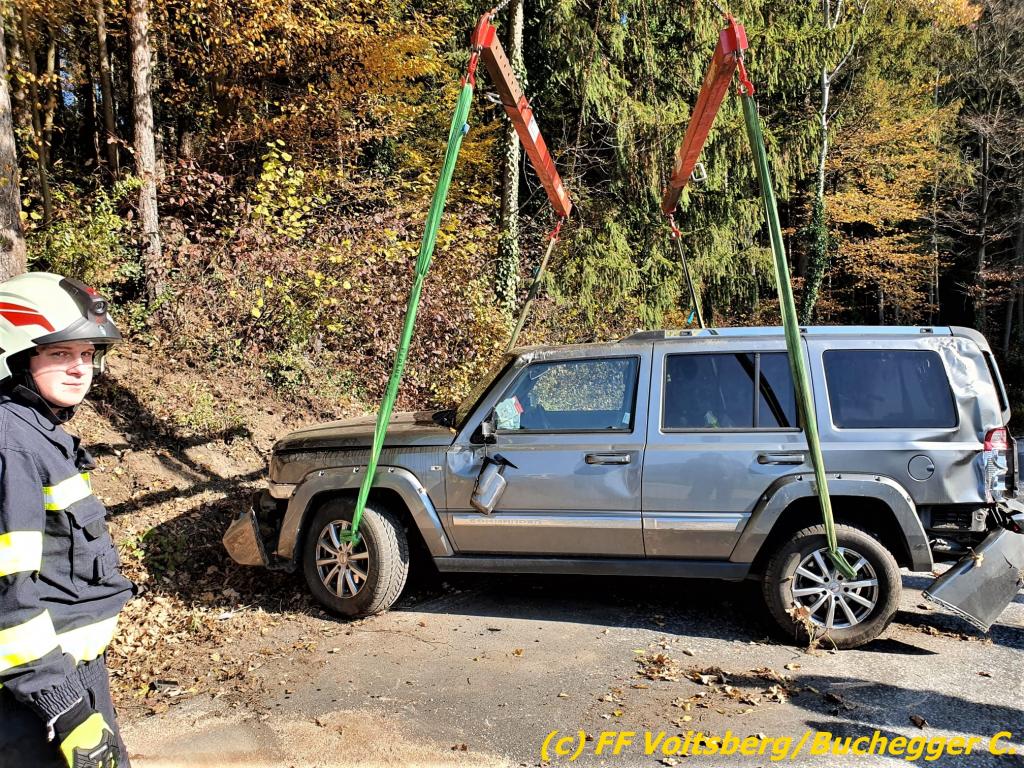 VOITSBERG, am 30.10.2021 Ein Pkw kam von der Landesstrasse ab, geriet auf eine Böschung und kippte seitlich um. Die einsatzleitende Feuerwehr Krems verständigte das WLF-Kran der FF Voitsberg.