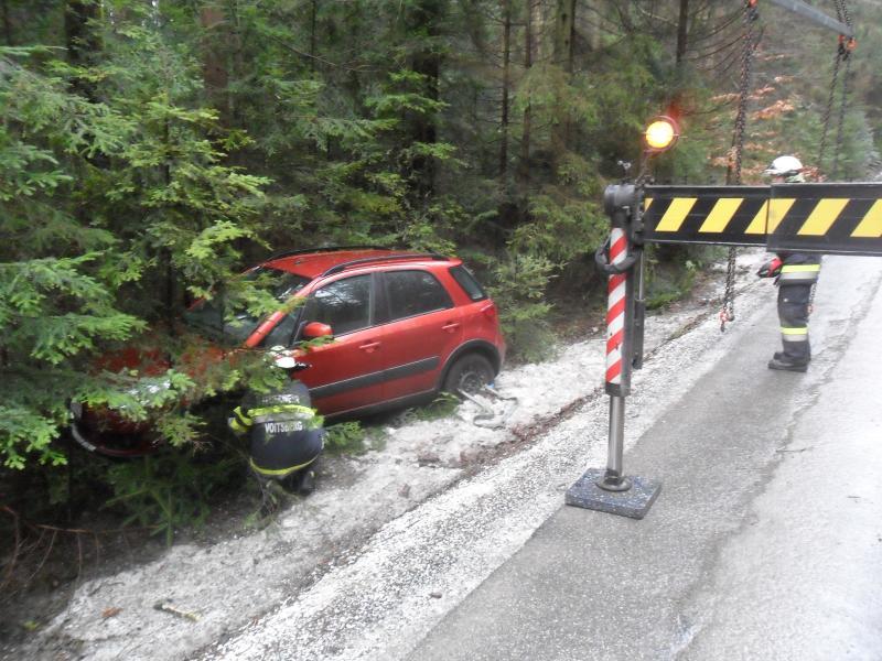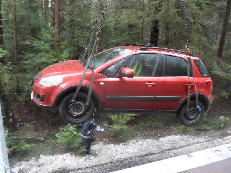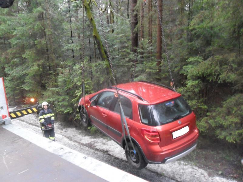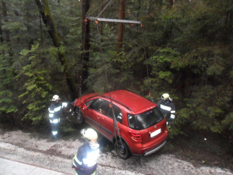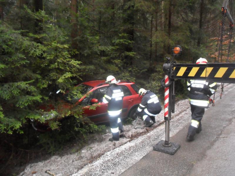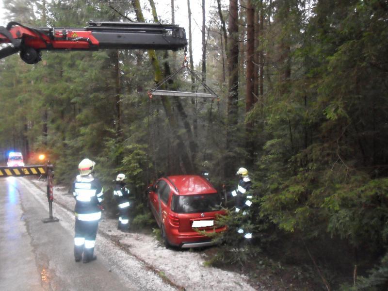Ein PKW kam von der Straße ab und landete im Straßengraben. Bergung mit dem WLF-Kran und Abtransport.