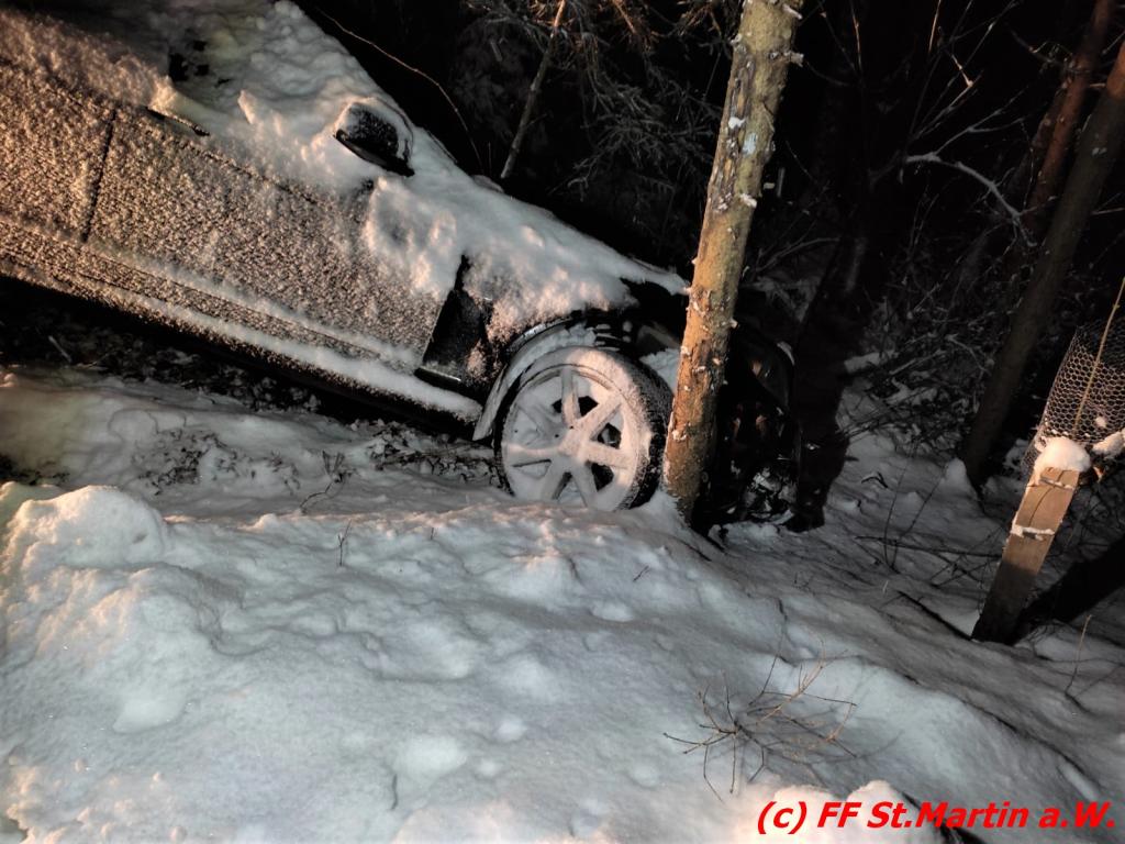 VOITSBERG, am 09.12.2021 Im Ortsteil Kleinwöllmiß der Gemeinde St. Martin a. W. kam am Donnerstag, 9. Dezember 2021 kurz nach 5 Uhr ein Pkw von der Straße ab, stürzte über eine Böschung und blieb an einem Baum hängen.