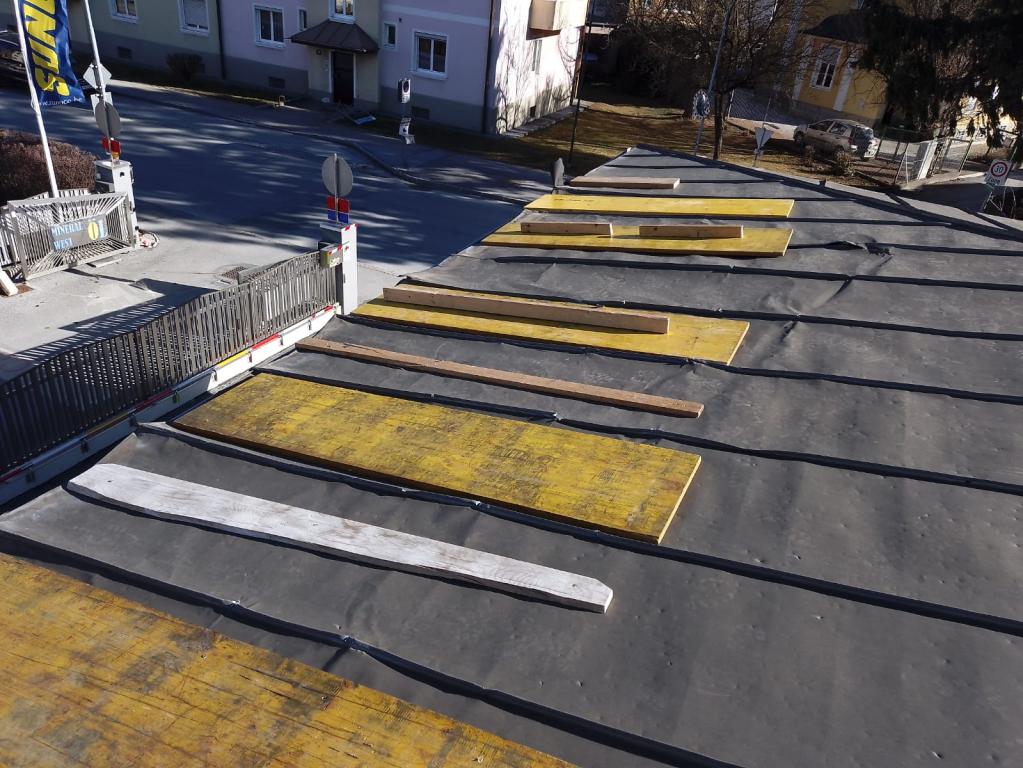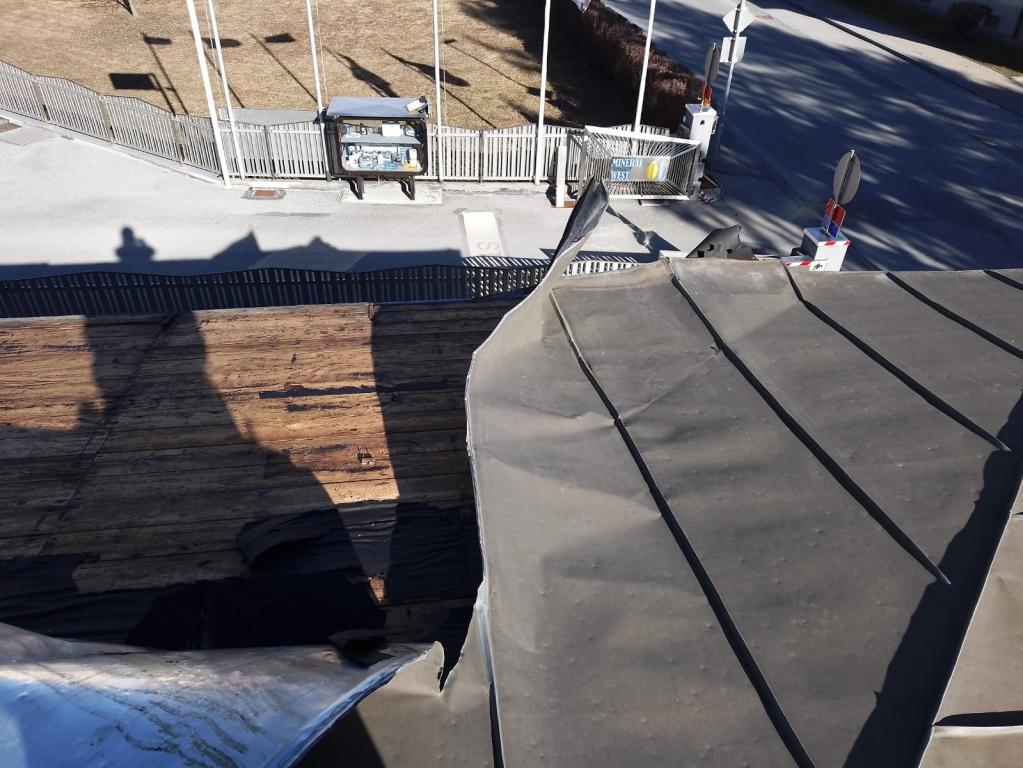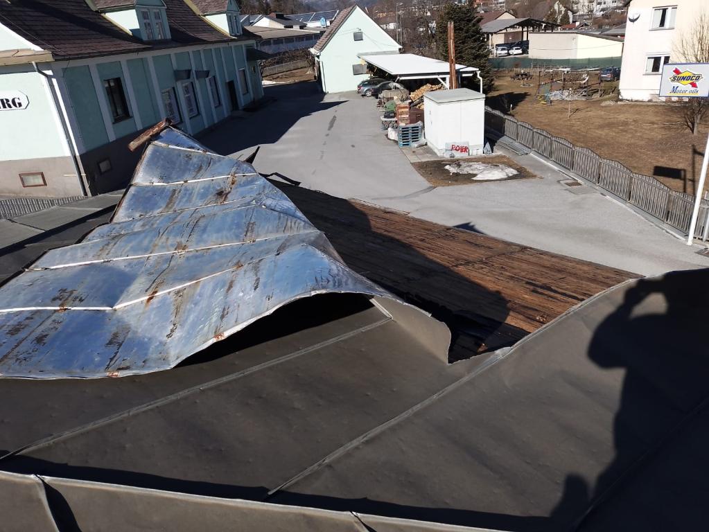Blechdach durch Sturm beschädigt - mit Holzstapeln und Schaltafeln Dach gesichert