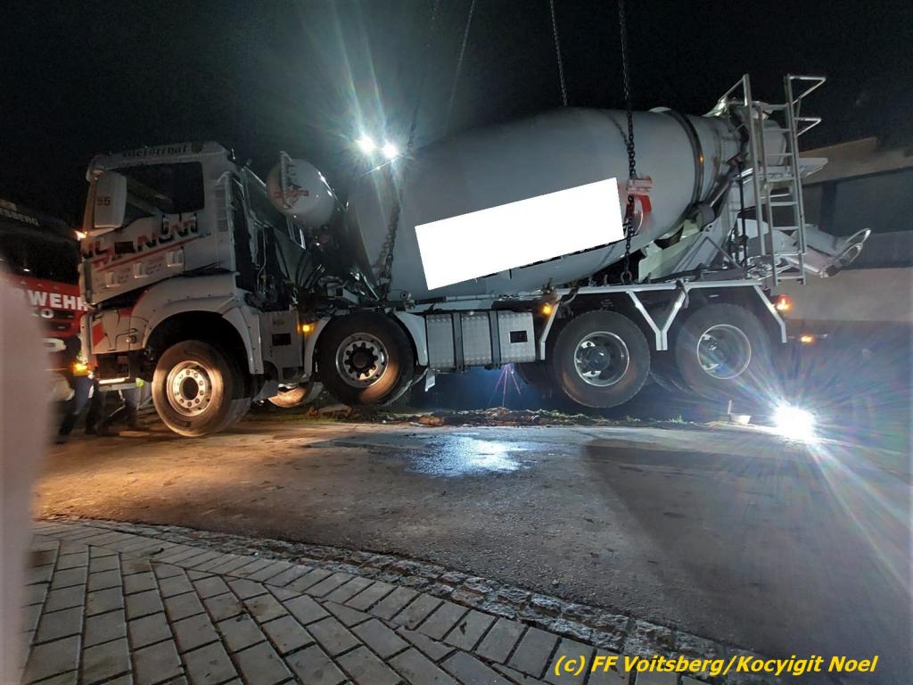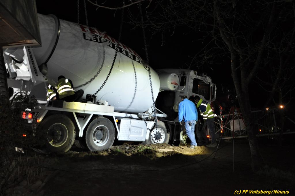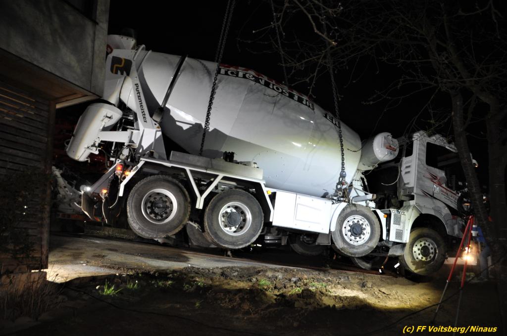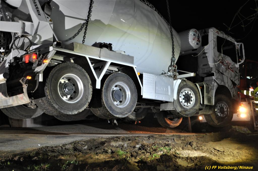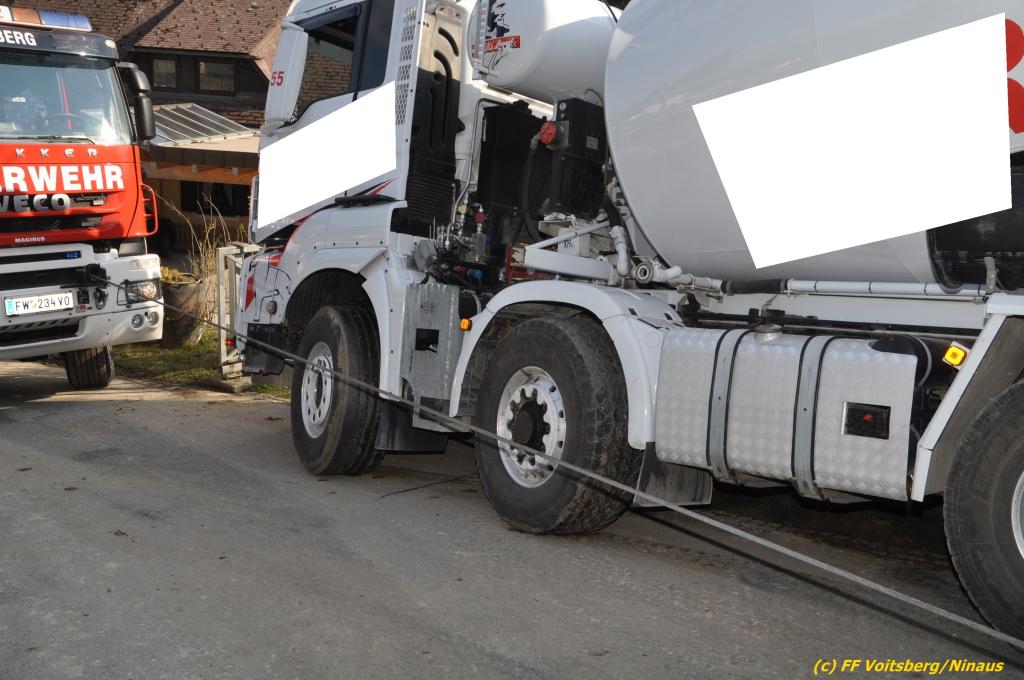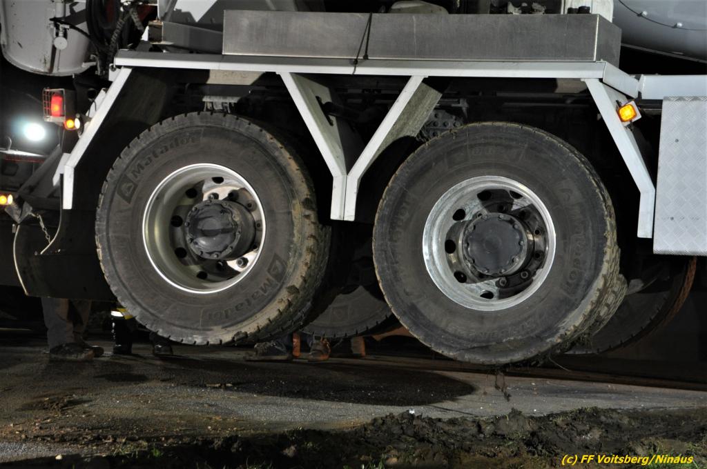 Ein beladener 4-Achs-Betonmischer kam beim Rückwärtsfahren auf einer Privatstrasse von dieser ab und geriet mit der rechten Seite in eine aufgeweichte Wiese und drohte umzustürzen.