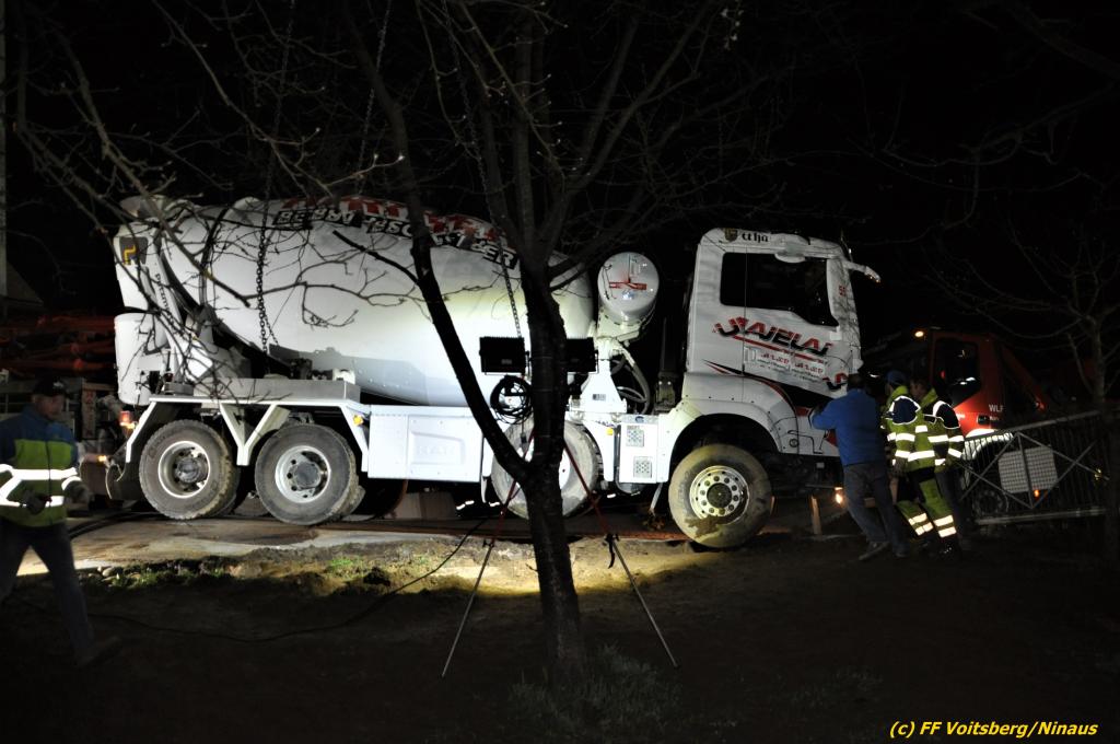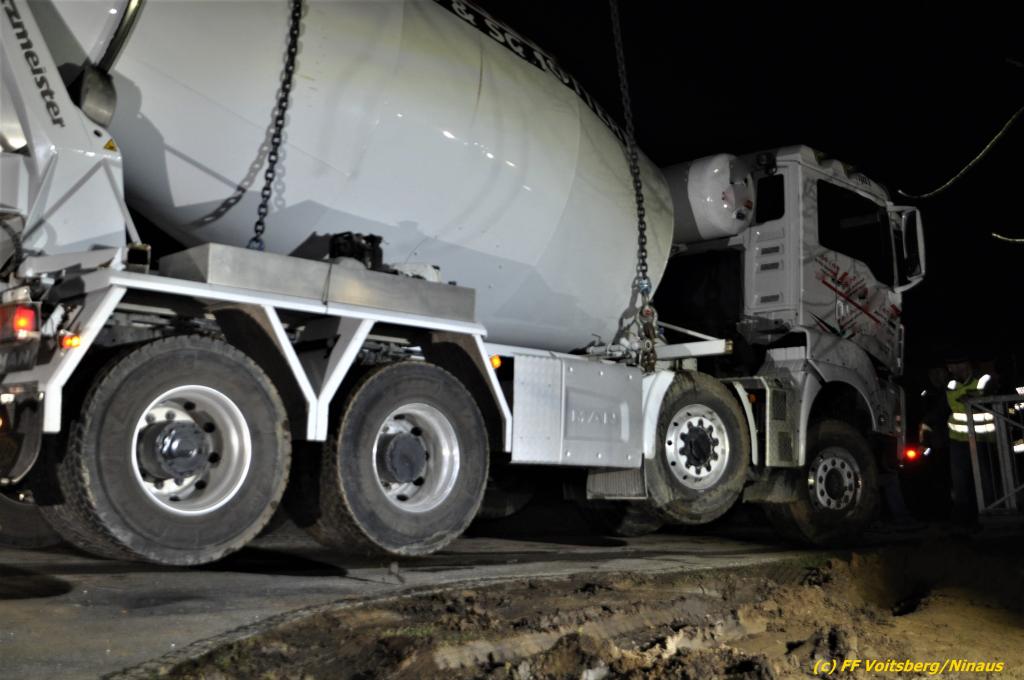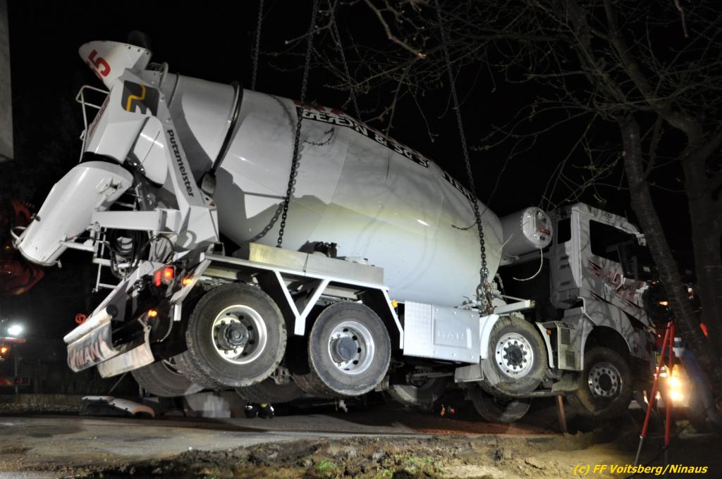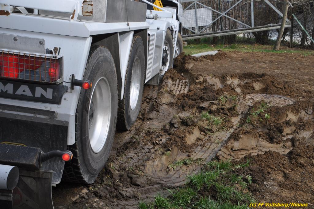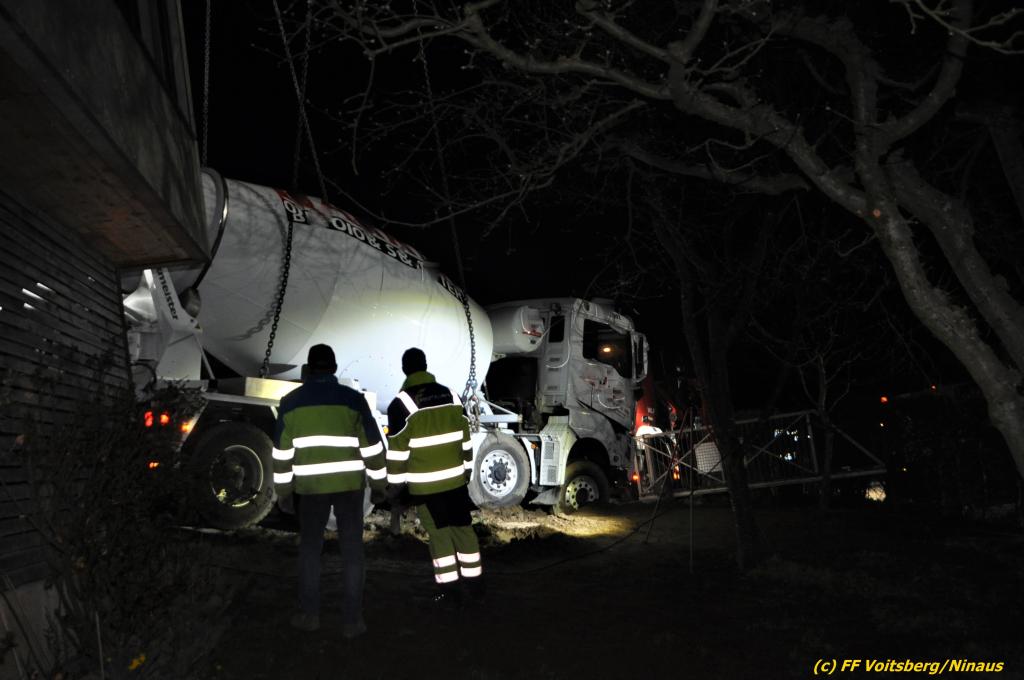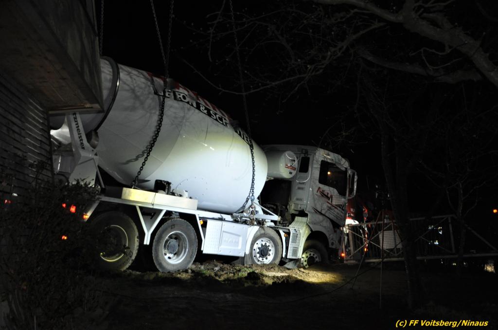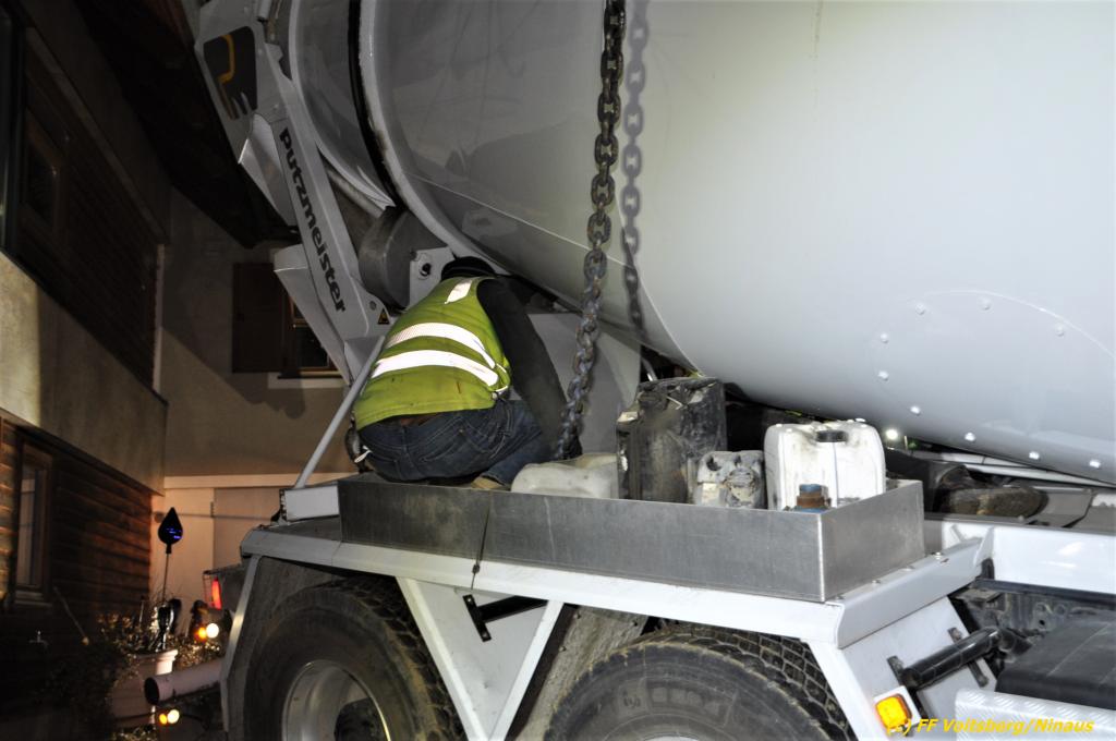 Ein beladener 4-Achs-Betonmischer kam beim Rückwärtsfahren auf einer Privatstrasse von dieser ab und geriet mit der rechten Seite in eine aufgeweichte Wiese und drohte umzustürzen.