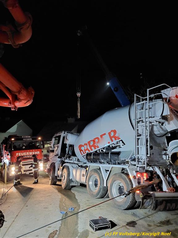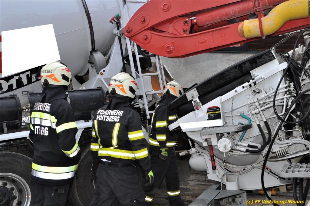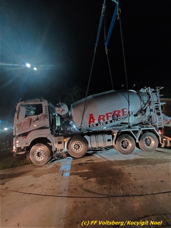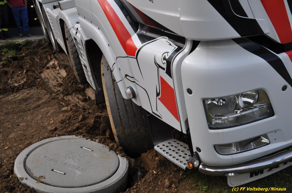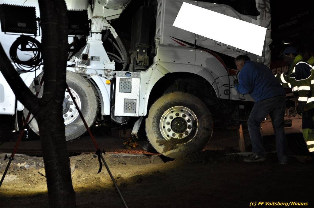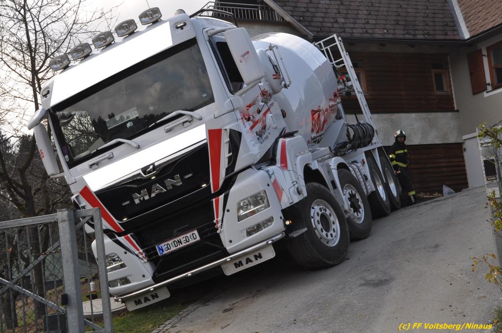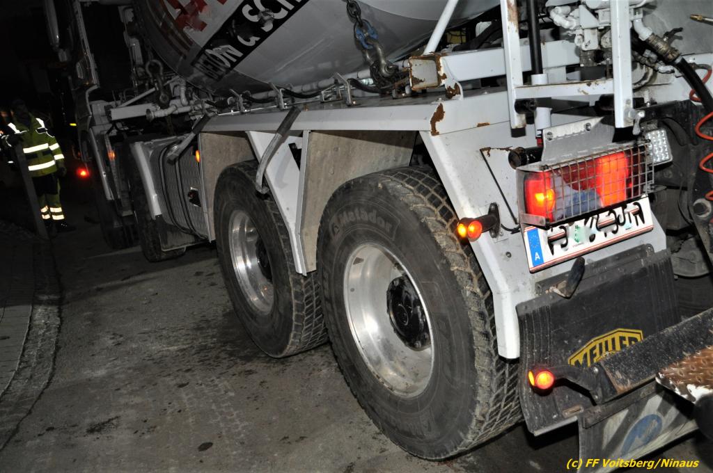Ein beladener 4-Achs-Betonmischer kam beim Rückwärtsfahren auf einer Privatstrasse von dieser ab und geriet mit der rechten Seite in eine aufgeweichte Wiese und drohte umzustürzen.