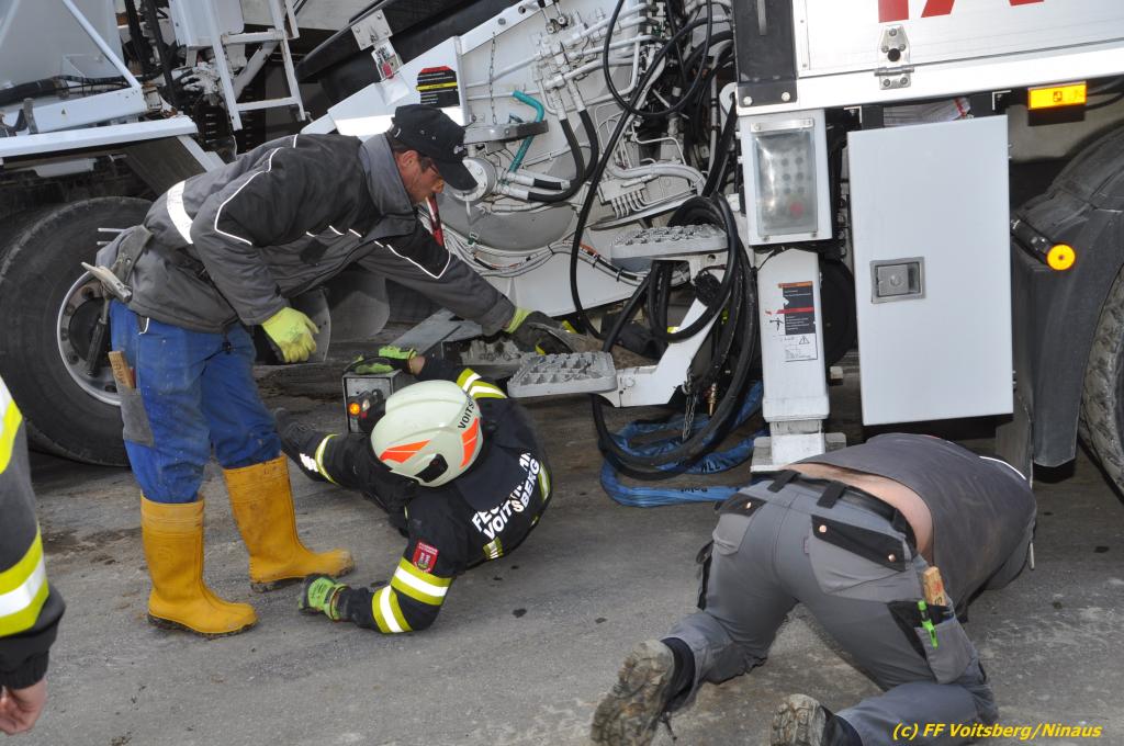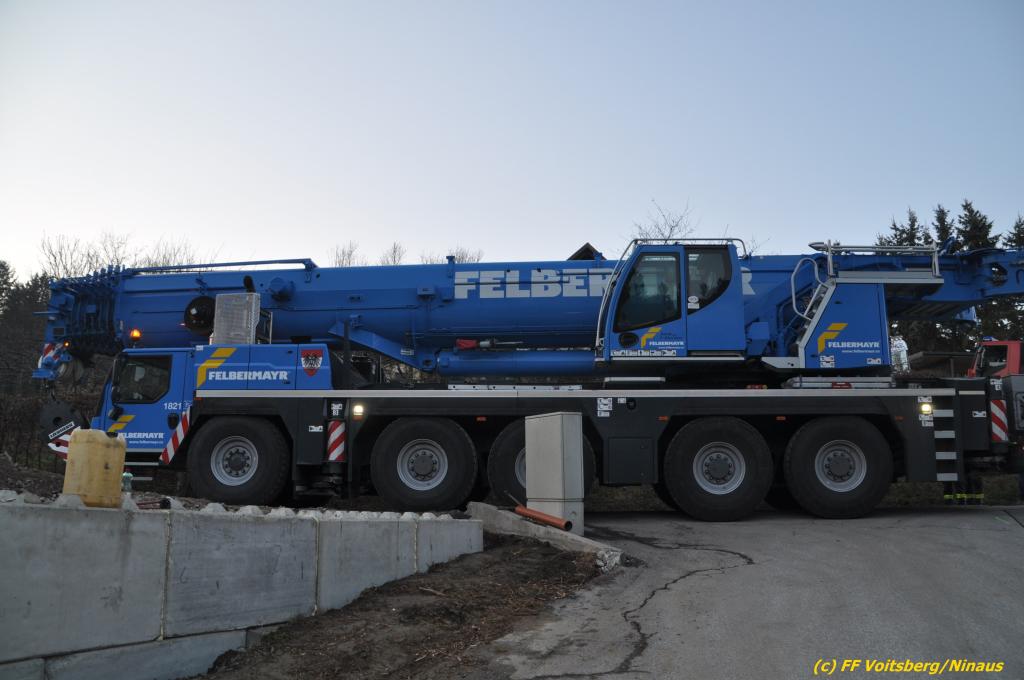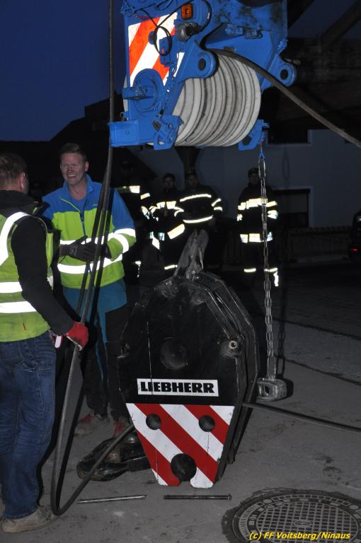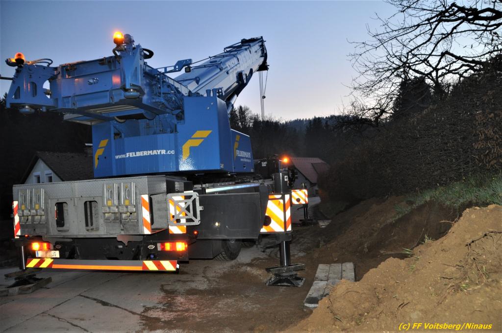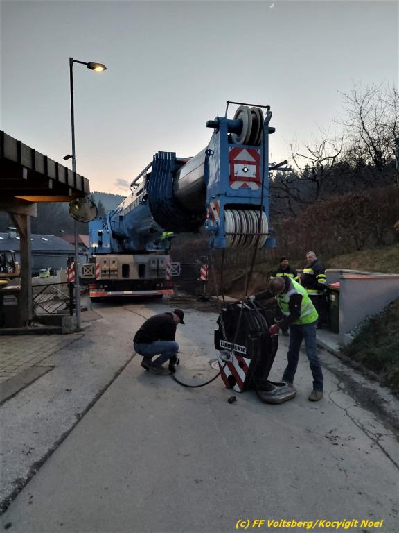 Das Fahrzeug wurde nach der Erkundung des Einsatzleiters mittels einer Umlenkrolle, dem WLF und einem Beton-Pumpwagen gesichert. Da sich die Bergung durch die FF Voitsberg als zu riskant darstellte, wurde ein 130t Kran einer Fachfirma aus Graz verständigt.