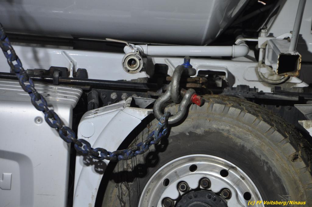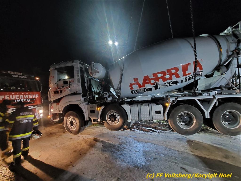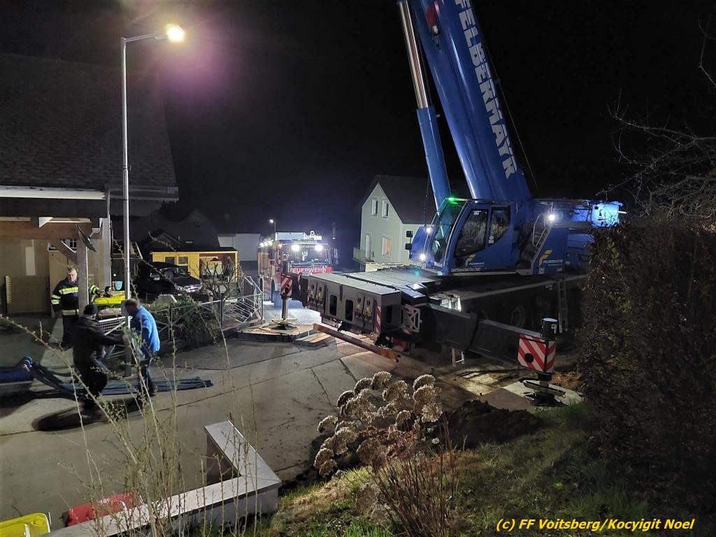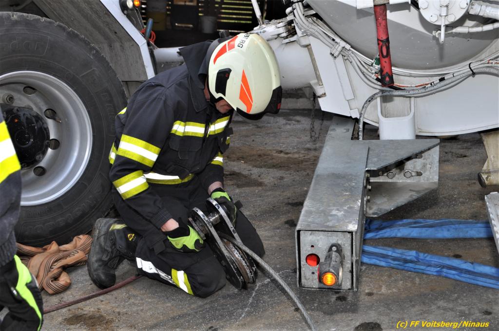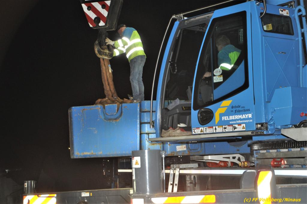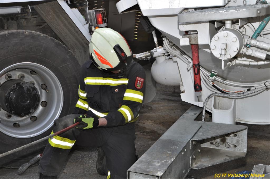 Nach umfangreichen Vorbereitungsarbeiten durch die Fachfirma mit Unterstützung der FF Voitsberg wurde das 35t schwere Fahrzeug unter Mithilfe der Seilwinde des WLF Voitsberg und den Pumpwagen sicher auf die Privatstrasse gehoben und konnte die Fahrt auf eigener Achse fortsetzen.