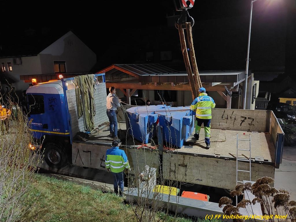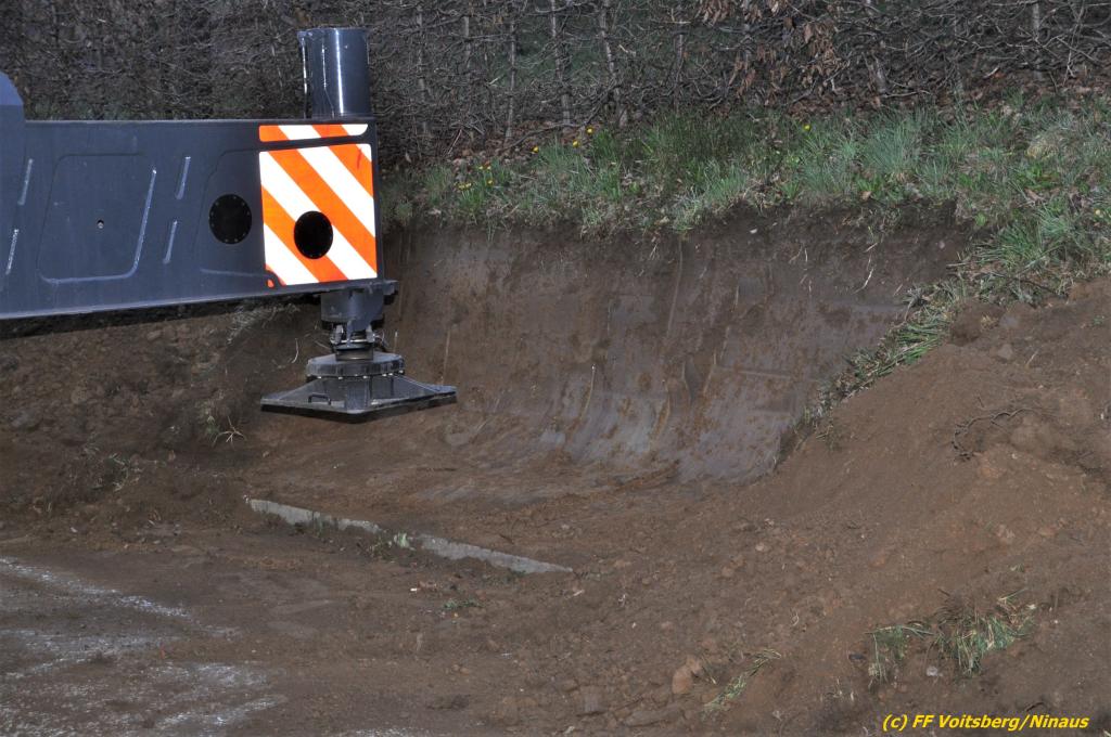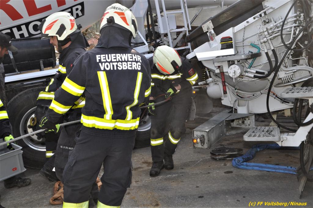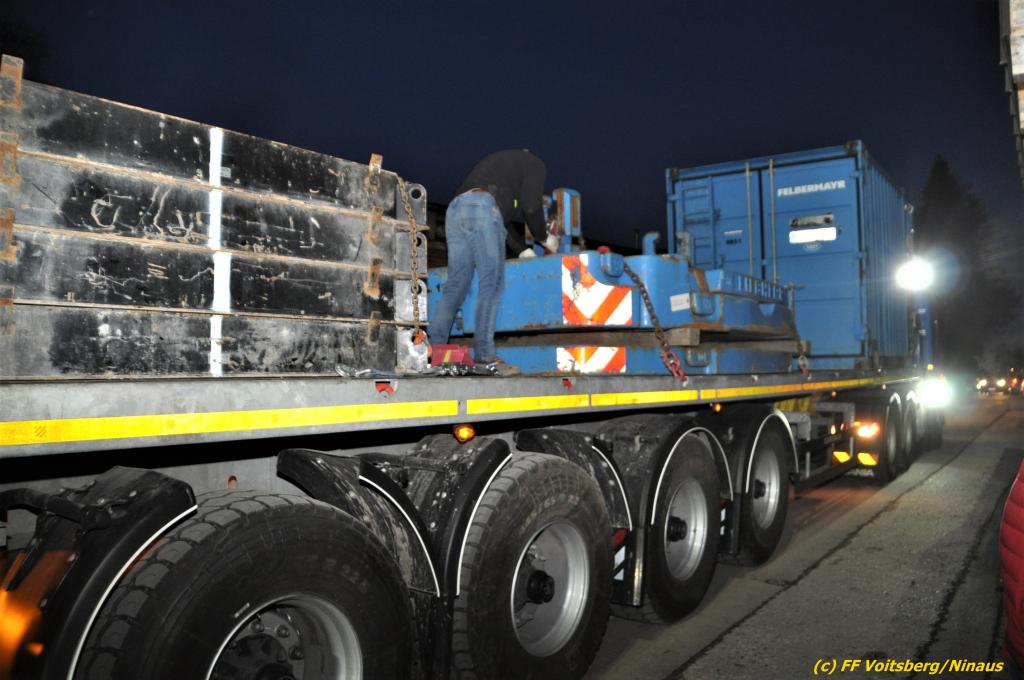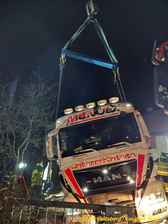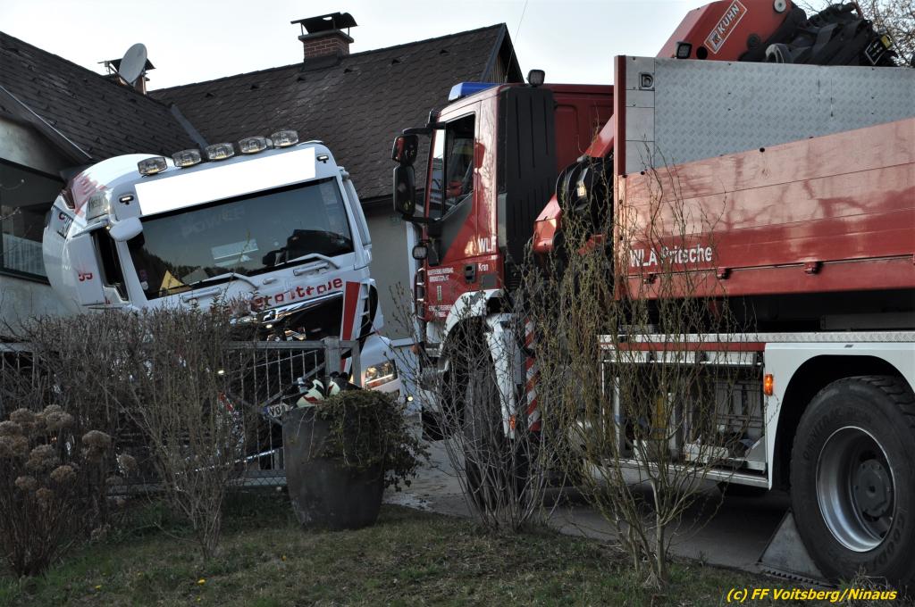 Nach umfangreichen Vorbereitungsarbeiten durch die Fachfirma mit Unterstützung der FF Voitsberg wurde das 35t schwere Fahrzeug unter Mithilfe der Seilwinde des WLF Voitsberg und den Pumpwagen sicher auf die Privatstrasse gehoben und konnte die Fahrt auf eigener Achse fortsetzen.